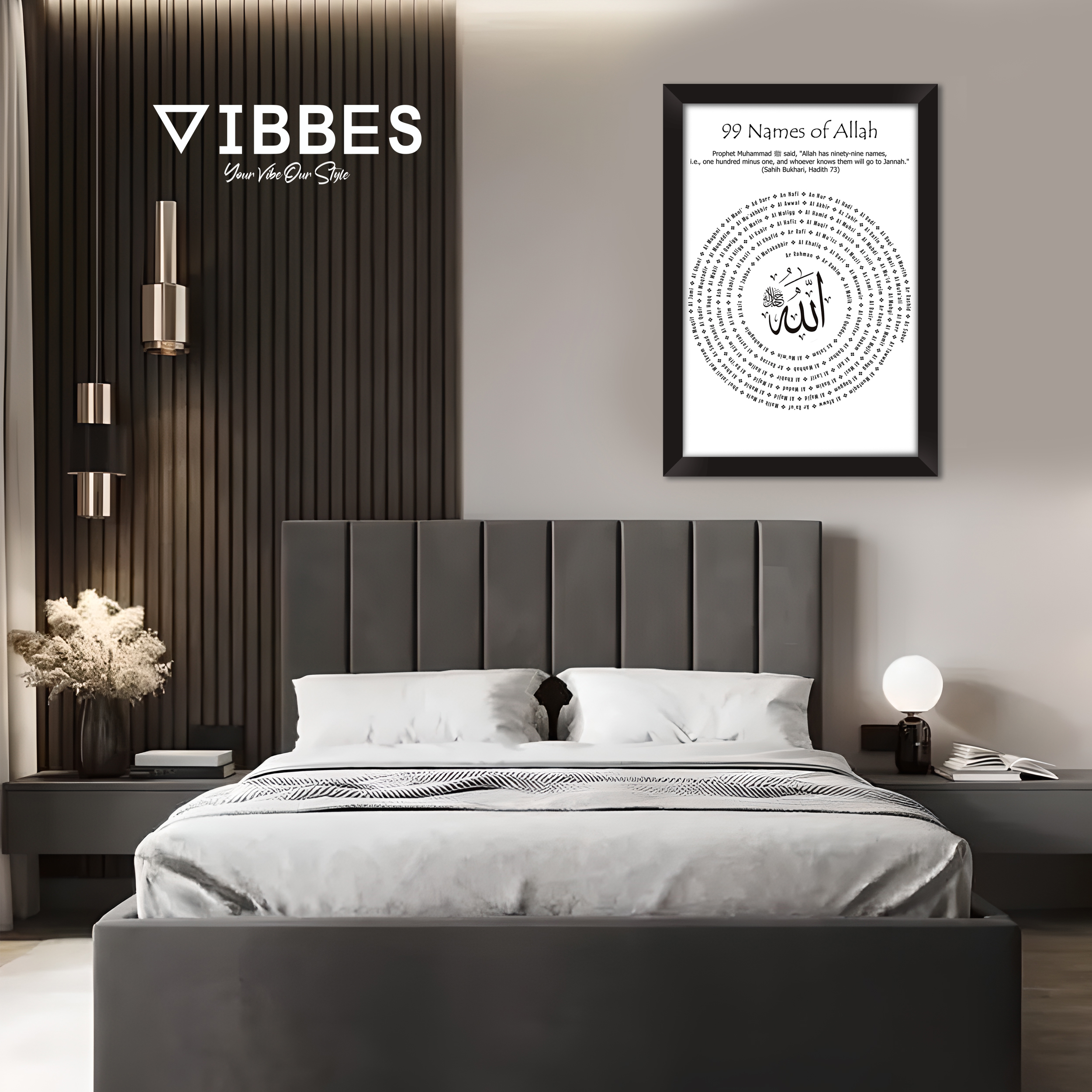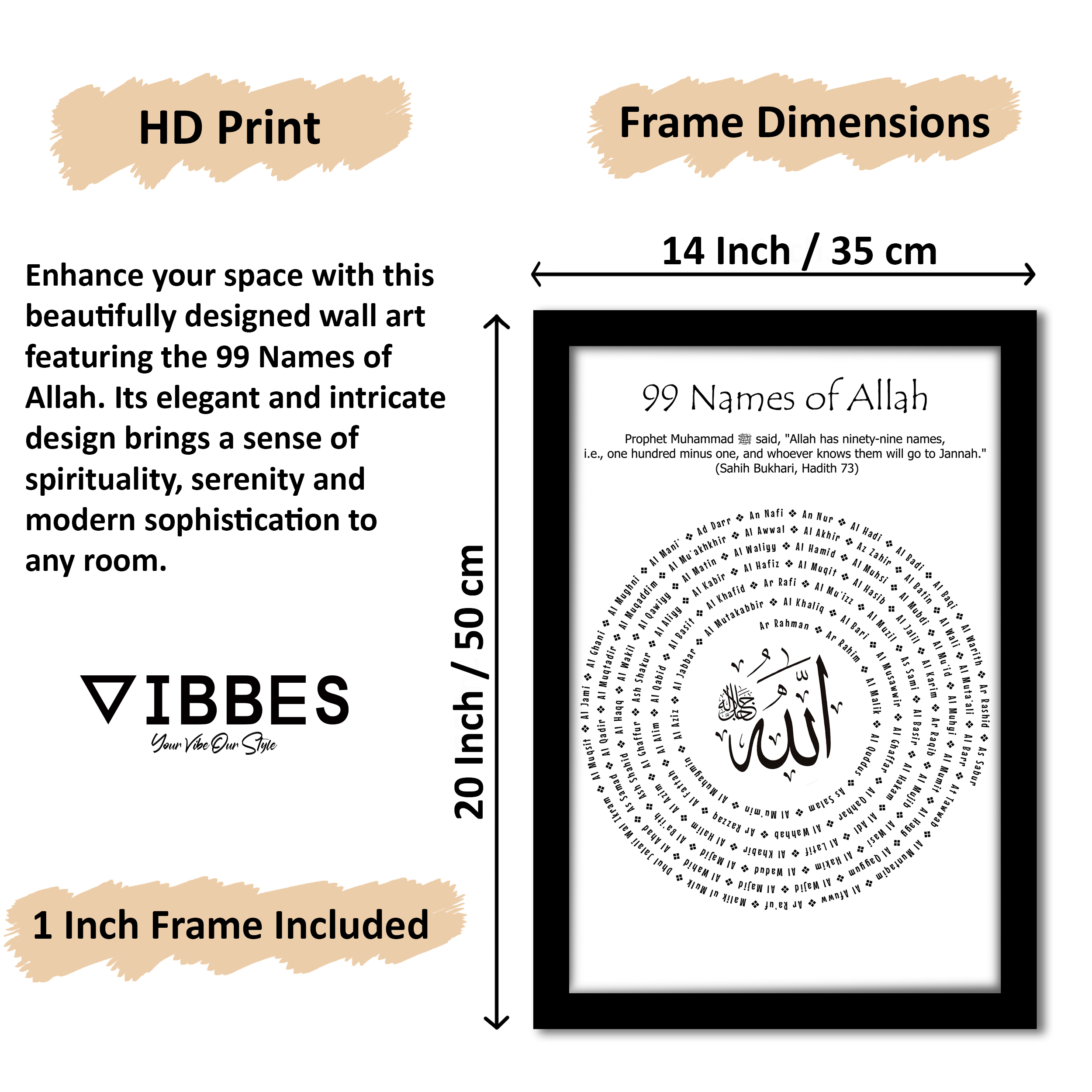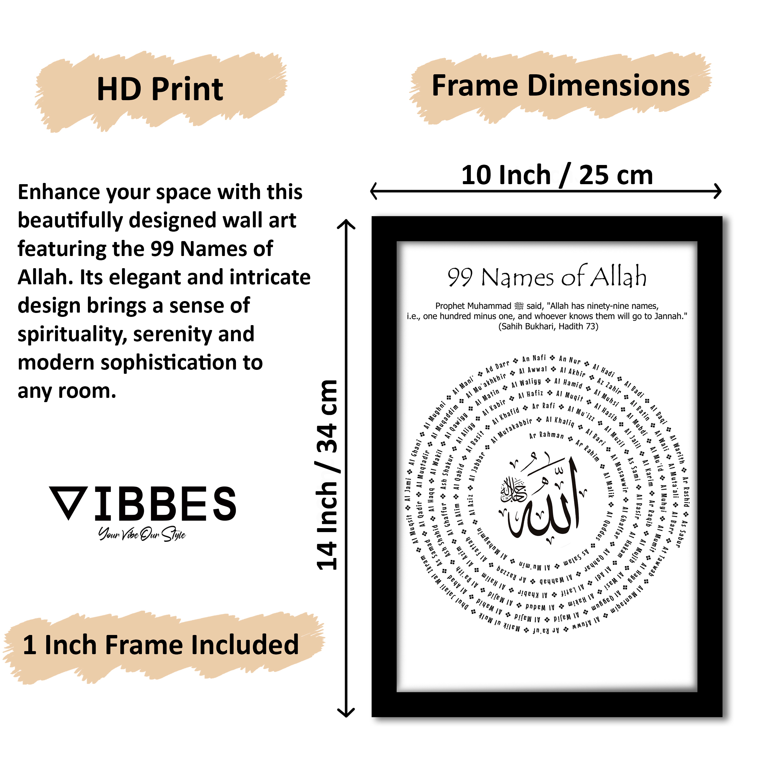 Enhance your spiritual space with the 99 Names of Allah (Asma Ul Husna) Islamic Wall Art by VIBBES. This elegant single-piece wall frame features the sacred 99 names arranged in a circular design around the central Arabic calligraphy of Allah, symbolizing unity, faith, and divine perfection.