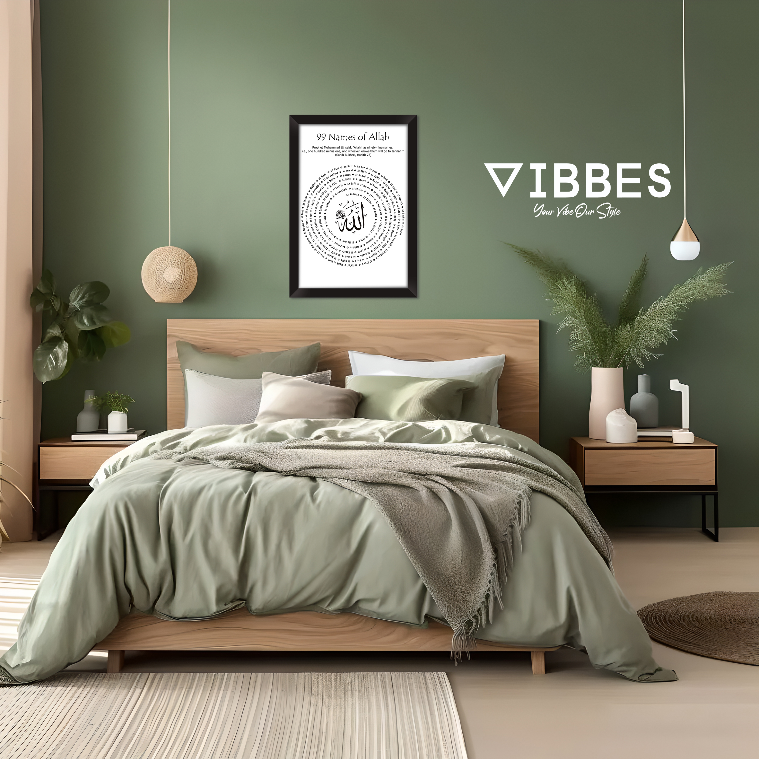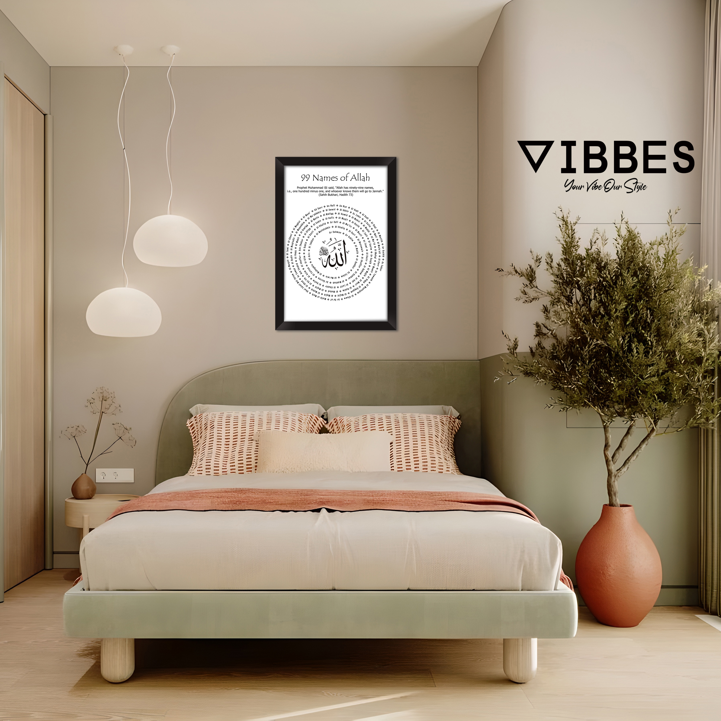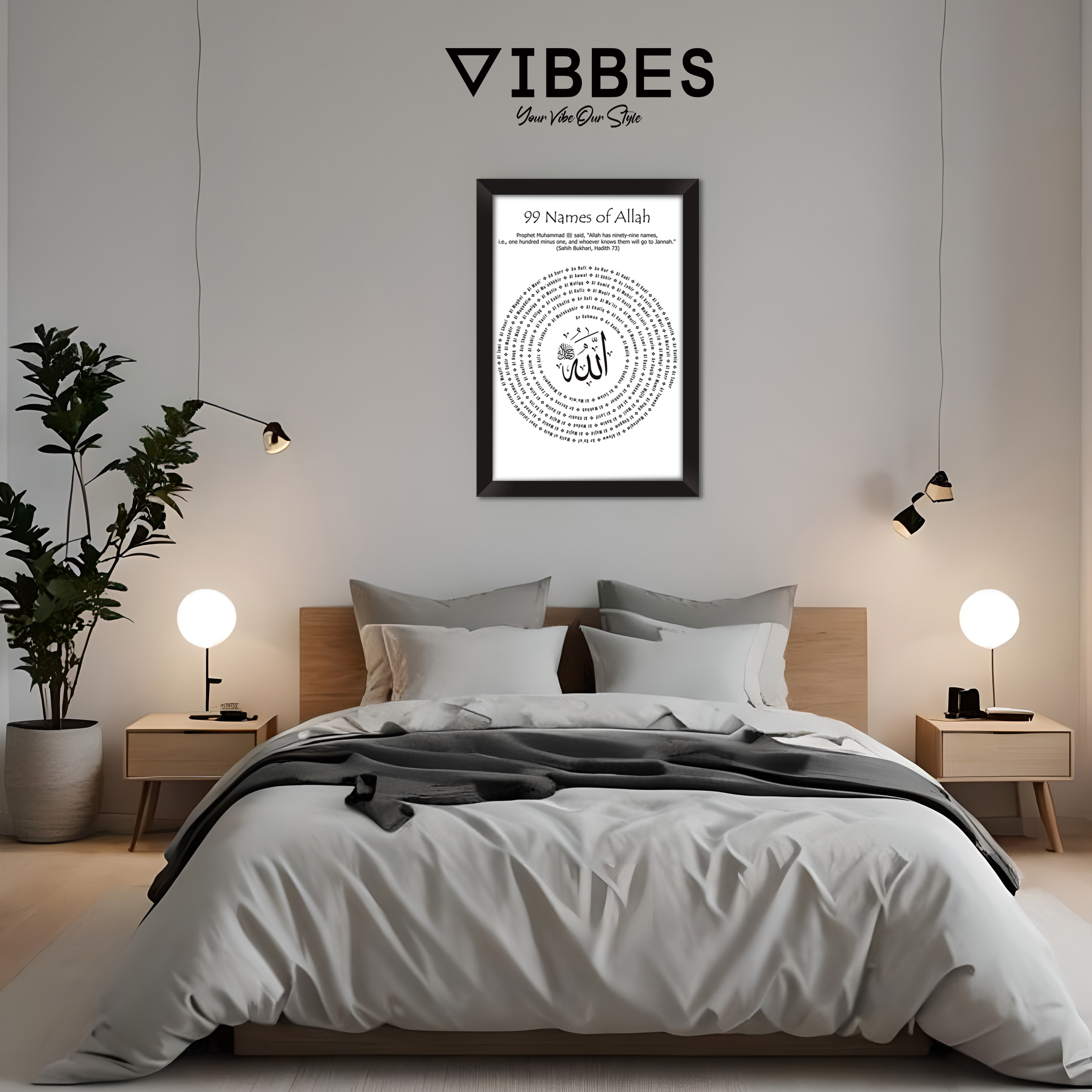Enhance your spiritual space with the 99 Names of Allah (Asma Ul Husna) Islamic Wall Art by VIBBES. This elegant single-piece wall frame features the sacred 99 names arranged in a circular design around the central Arabic calligraphy of Allah, symbolizing unity, faith, and divine perfection.