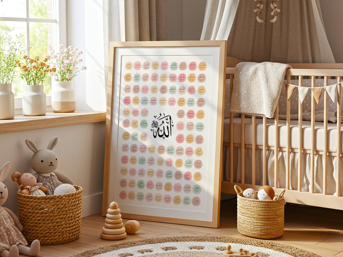 Exquisite Craftsmanship The artwork features the 99 Names of Allah rendered in high-definition Arabic calligraphy. Many designs prominently feature the central name "Allah" to anchor the composition. Background styles range from minimalist tan to deep, textured dark tones that symbolize the infinite mercy of the Creator.