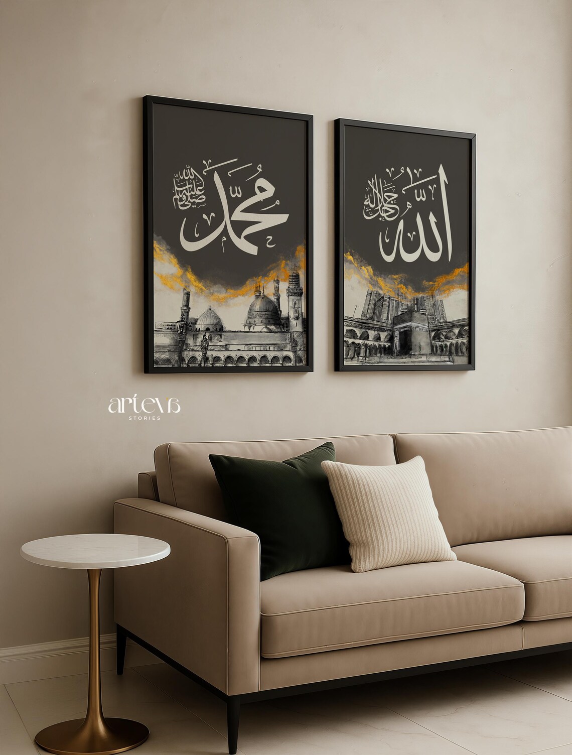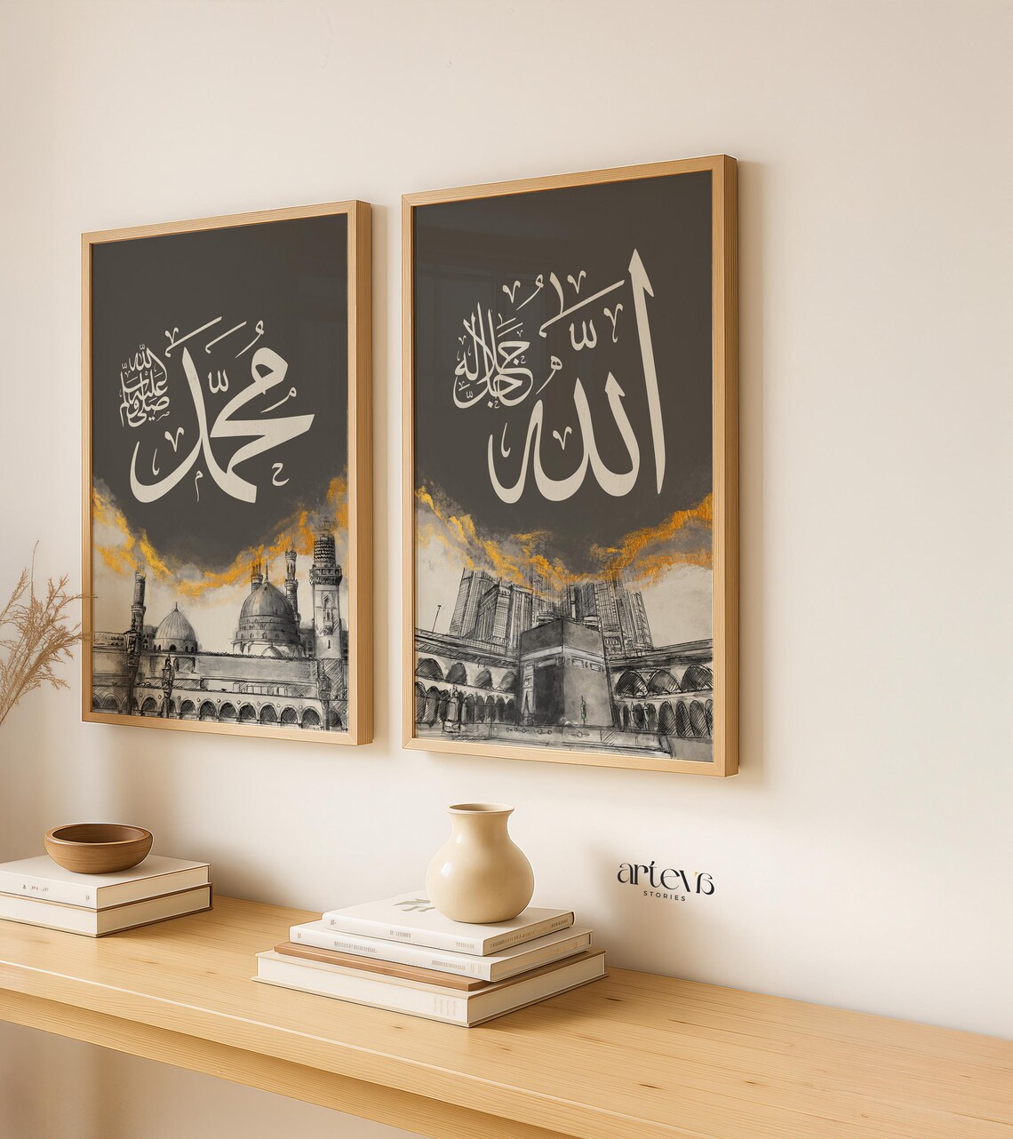 The Architectural Sketch Series Invite the spiritual essence of the two holiest sites in Islam into your home with our Allah & Muhammad Architectural Sketch Series. This collection is a beautiful fusion of sacred calligraphy and architectural artistry, designed for those who wish to keep the memory of Makkah and Madinah alive in their daily environment. Featuring detailed, hand-drawn style sketches of the Kaaba and Masjid an-Nabawi, this set provides a profound visual connection to the heart of the Muslim world.