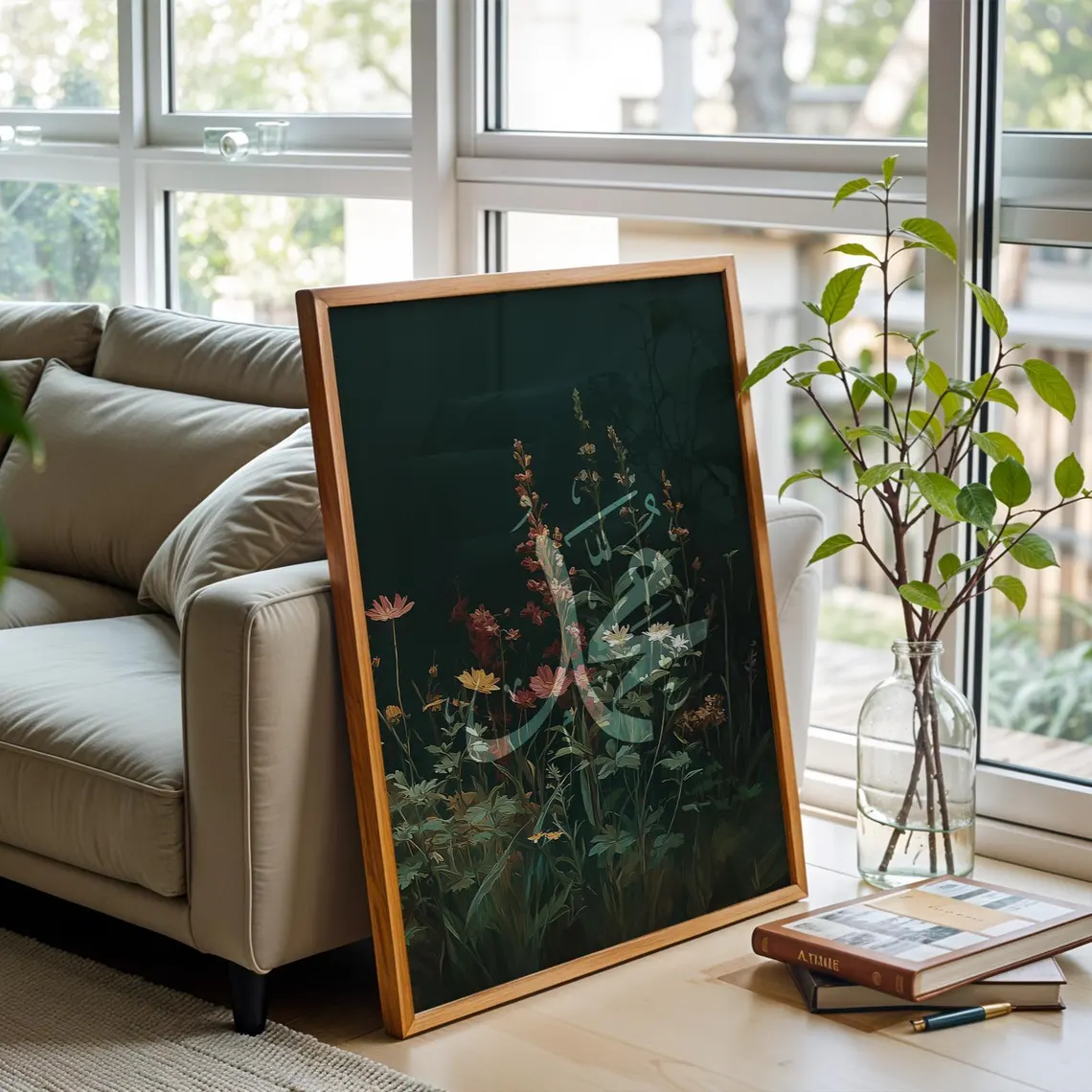 A Focal Point of Spiritual Light In Islamic tradition, the names of Allah and Muhammad are considered the ultimate sources of guidance and light. This art piece interprets that truth visually; the high-contrast white calligraphy acts as a beacon against the dark void of the background. This serves as an immediate focal point for Dhikr (remembrance), encouraging a moment of pause and reflection every time you pass by. The integration of flowers—ranging from delicate petals to reaching stems—ensures that while the piece is bold and modern, it remains soft, organic, and life-affirming.