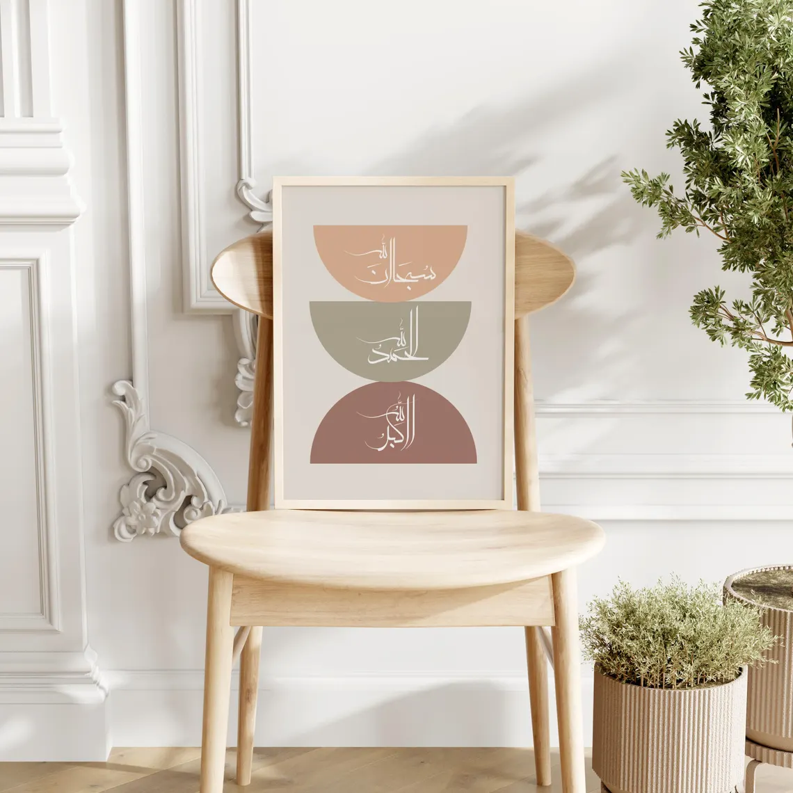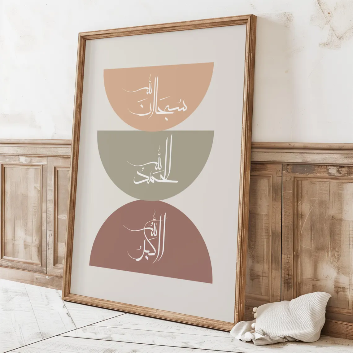 Modernity Meets Spirituality Our "Aura Dhikr" series represents a sophisticated shift in Islamic wall decor. Designed for the modern aesthetic, this piece departs from traditional ornate borders and instead embraces a clean, geometric abstract style. The artwork centers around three balanced semi-circles in a harmonious palette of soft terracotta, muted sage, and warm mauve. Each shape serves as a foundation for elegant, flowing Arabic script representing the essential phrases of remembrance: SubhanAllah, Alhamdulillah, and Allahu Akbar.
