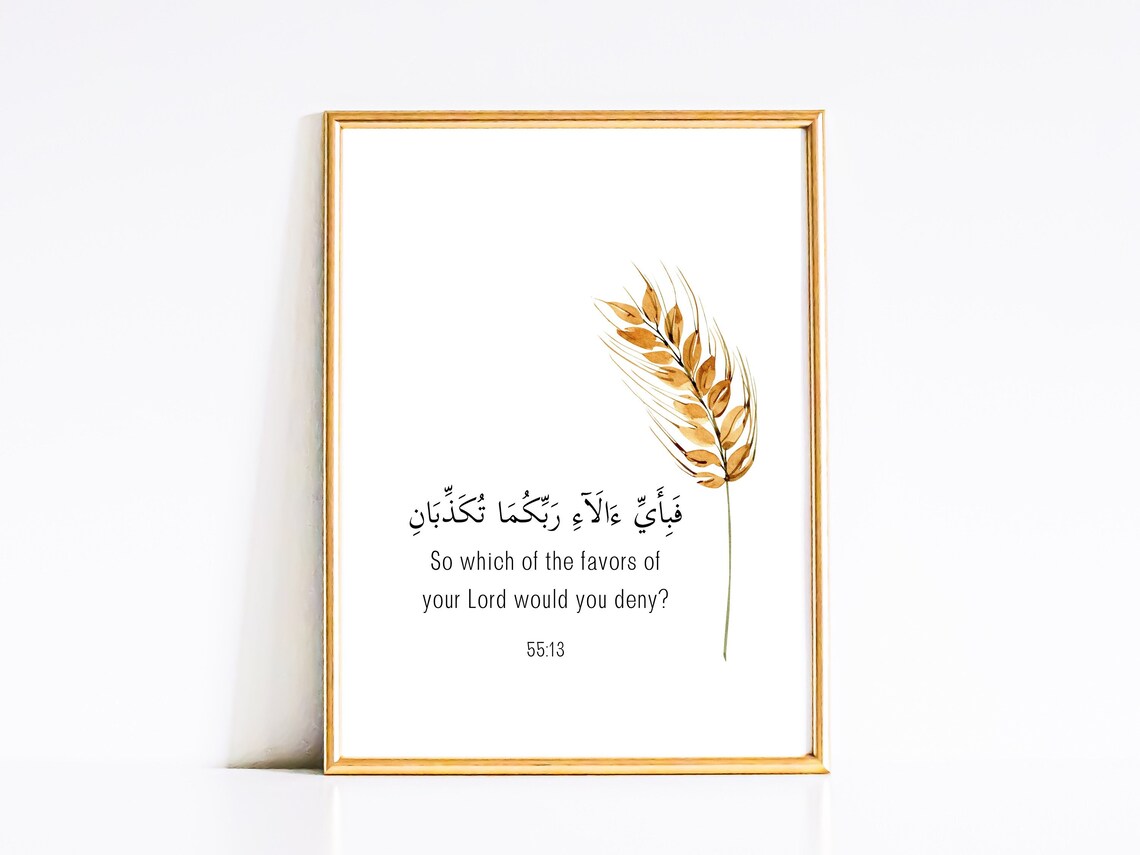 A Timeless Reminder of Infinite Blessings Cultivate a spirit of gratitude (Shukr) in your home with our "Botanical Gratitude" framed art. This elegant piece features the iconic and rhythmic refrain from Surah Ar-Rahman (55:13): "So which of the favors of your Lord would you deny?" It is a verse that invites deep reflection on the countless visible and invisible blessings bestowed upon us, serving as a gentle nudge to remain thankful in every state of life.