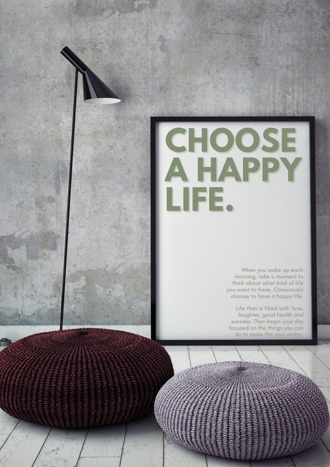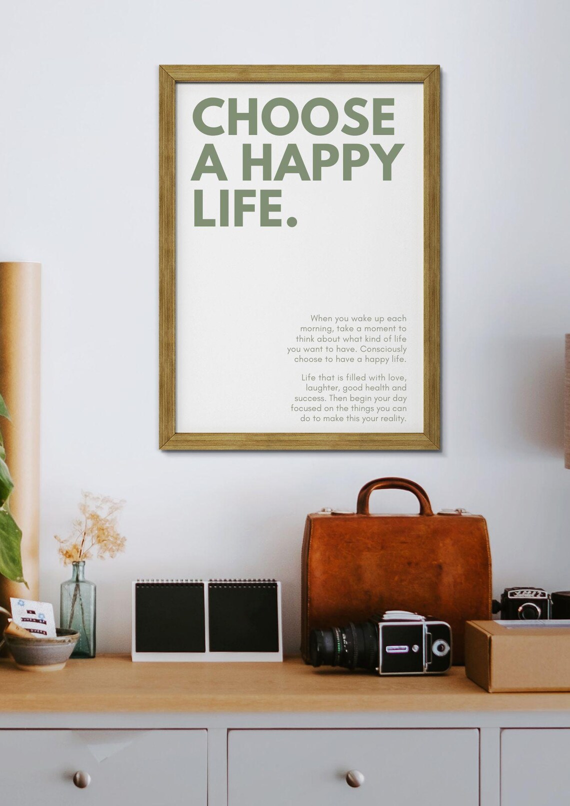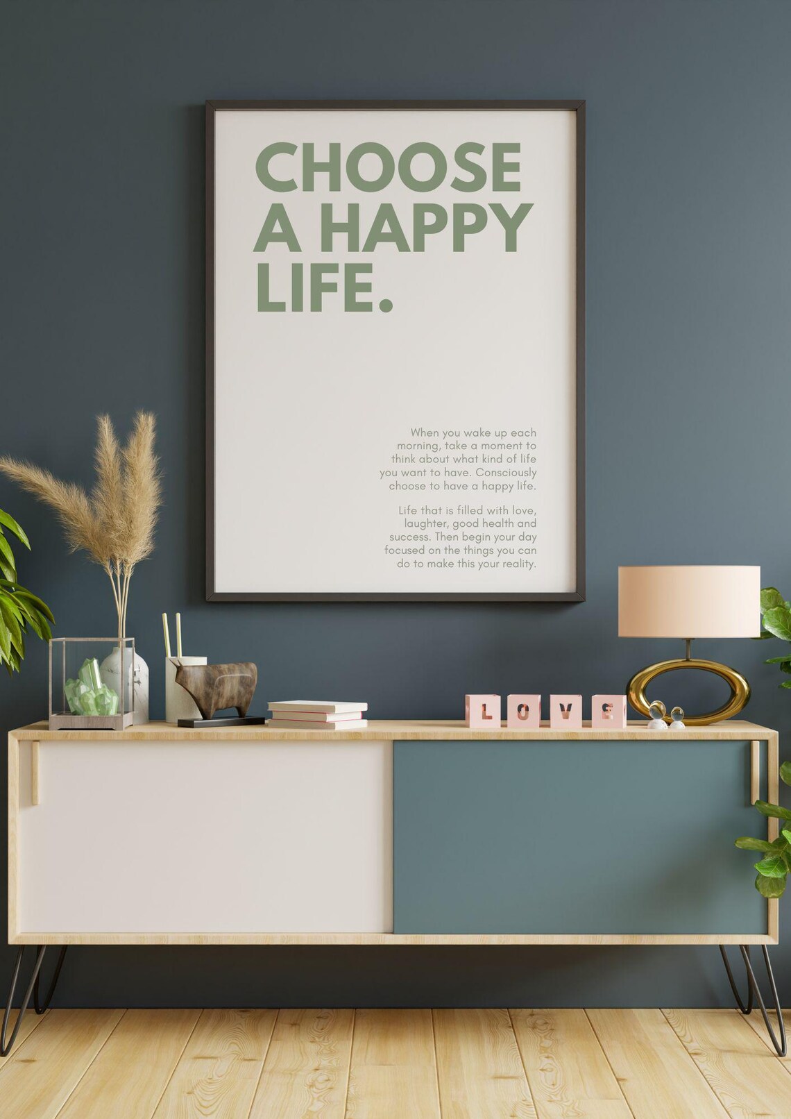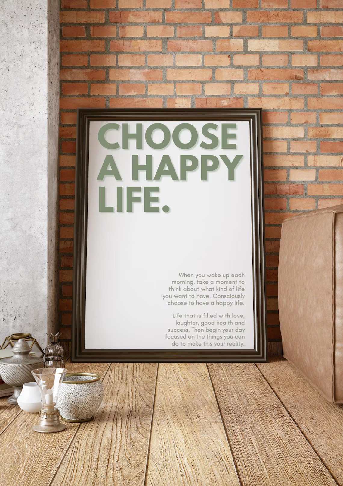 The Headline: The phrase "CHOOSE A HAPPY LIFE" is rendered in a large, bold sans-serif font using a calming sage green. This color choice is intentional, evoking feelings of growth, tranquility, and renewal.