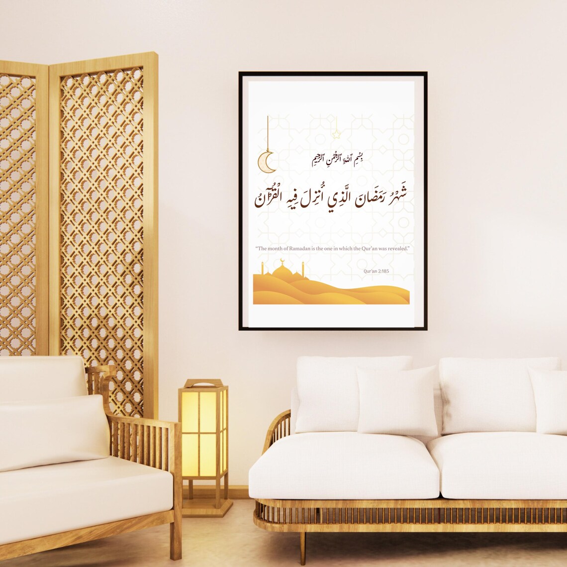 Contemporary Square Framing: Housed in a natural light-wood frame, the square format offers a modern look that fits perfectly in entryways, living rooms, or dining areas where the family gathers for Iftar.