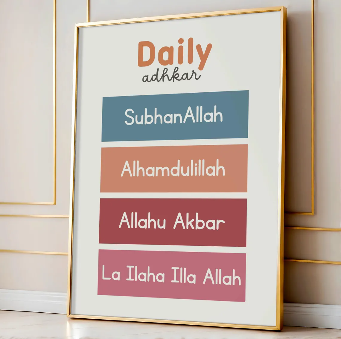 A Contemporary Approach to Spiritual Learning Nurture your child's spiritual growth with our Modern Block-Style Daily Adhkar Kids' Art. This piece is designed for the modern Muslim home, blending clean, contemporary aesthetics with the timeless practice of "Dhikr" (remembrance). Featuring the foundational phrases of praise—SubhanAllah, Alhamdulillah, Allahu Akbar, and La Ilaha Illallah—this artwork serves as a sophisticated yet accessible reminder for children to keep their tongues moist with the remembrance of Allah.