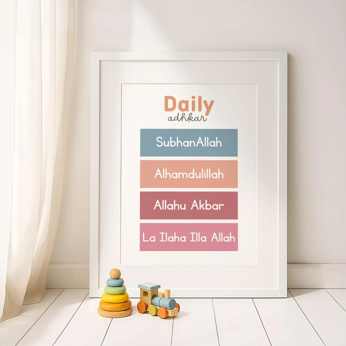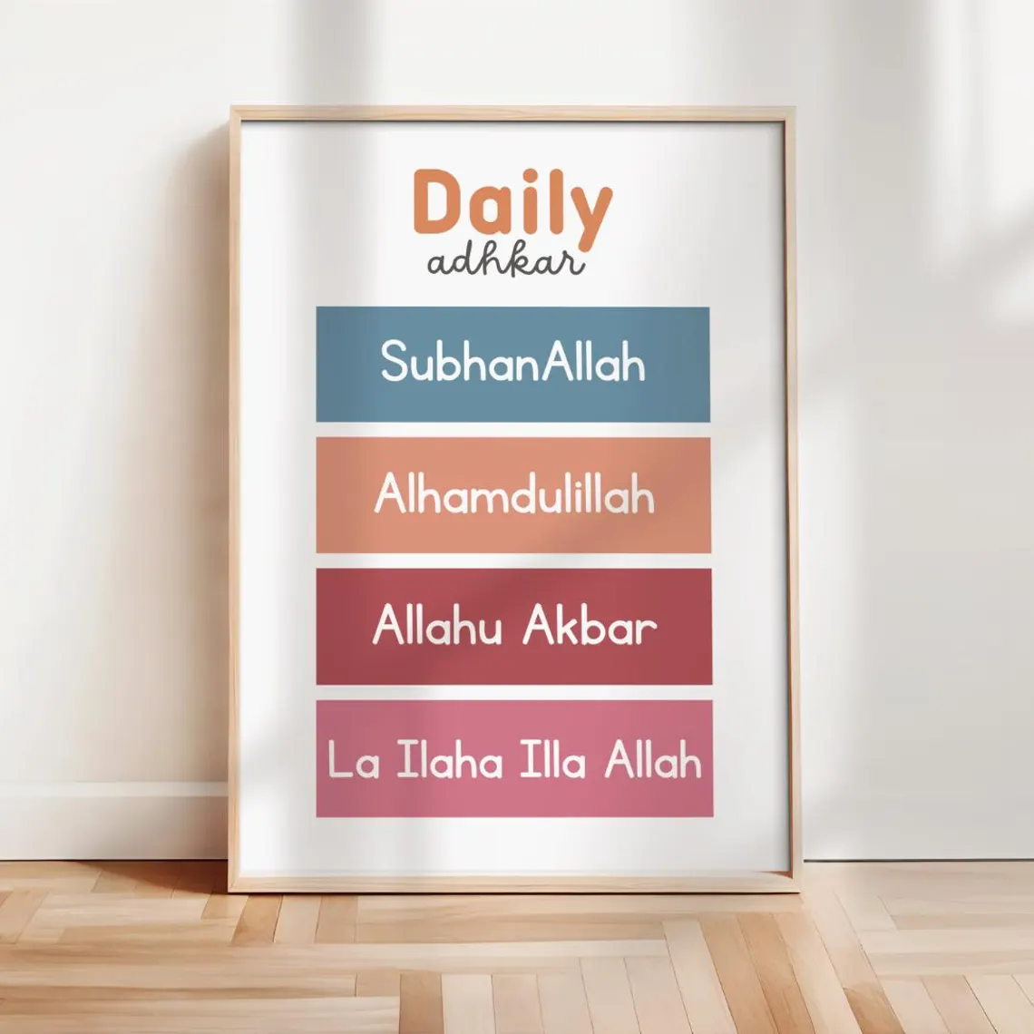 Design Philosophy: Clarity and Sophistication Unlike traditional children's decor, this piece utilizes a structured, block-style layout that appeals to both young children and style-conscious parents. The "Daily Adhkar" title is presented in a friendly, modern font at the top. Below, each sacred phrase is set within a solid color block—slate blue, muted terracotta, dusty rose, and soft mauve—creating a calm and orderly visual flow. This sophisticated palette allows the artwork to grow with your child, looking just as appropriate in a teenager's study as it does in a newborn's nursery.