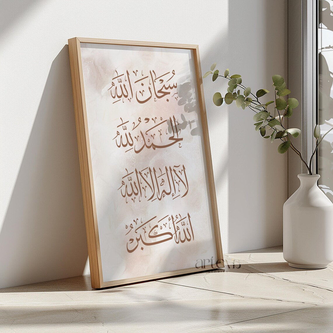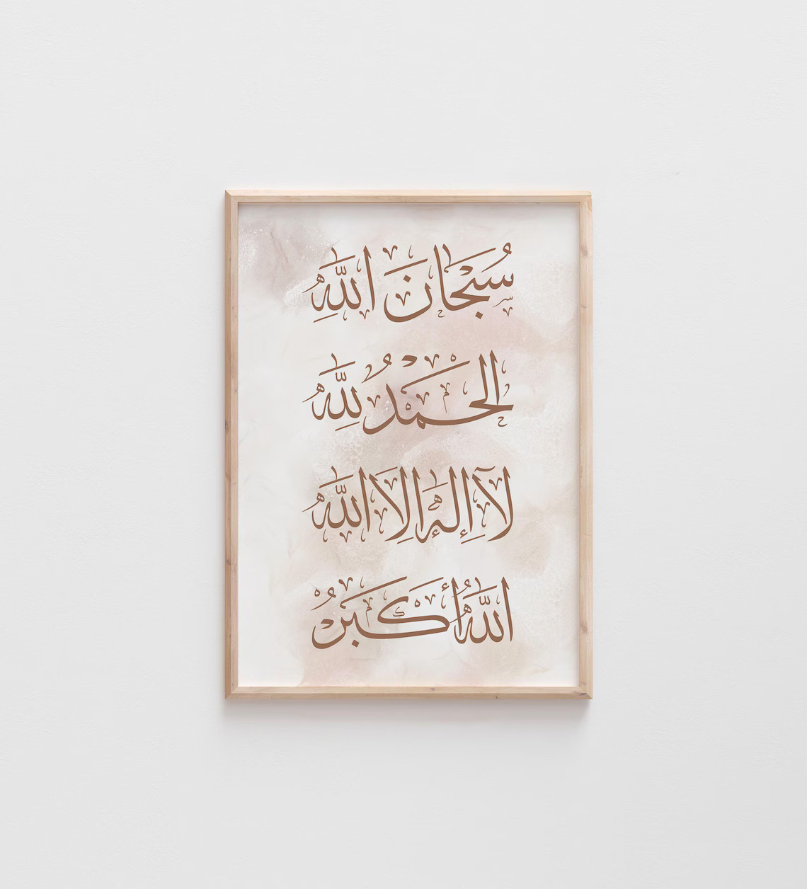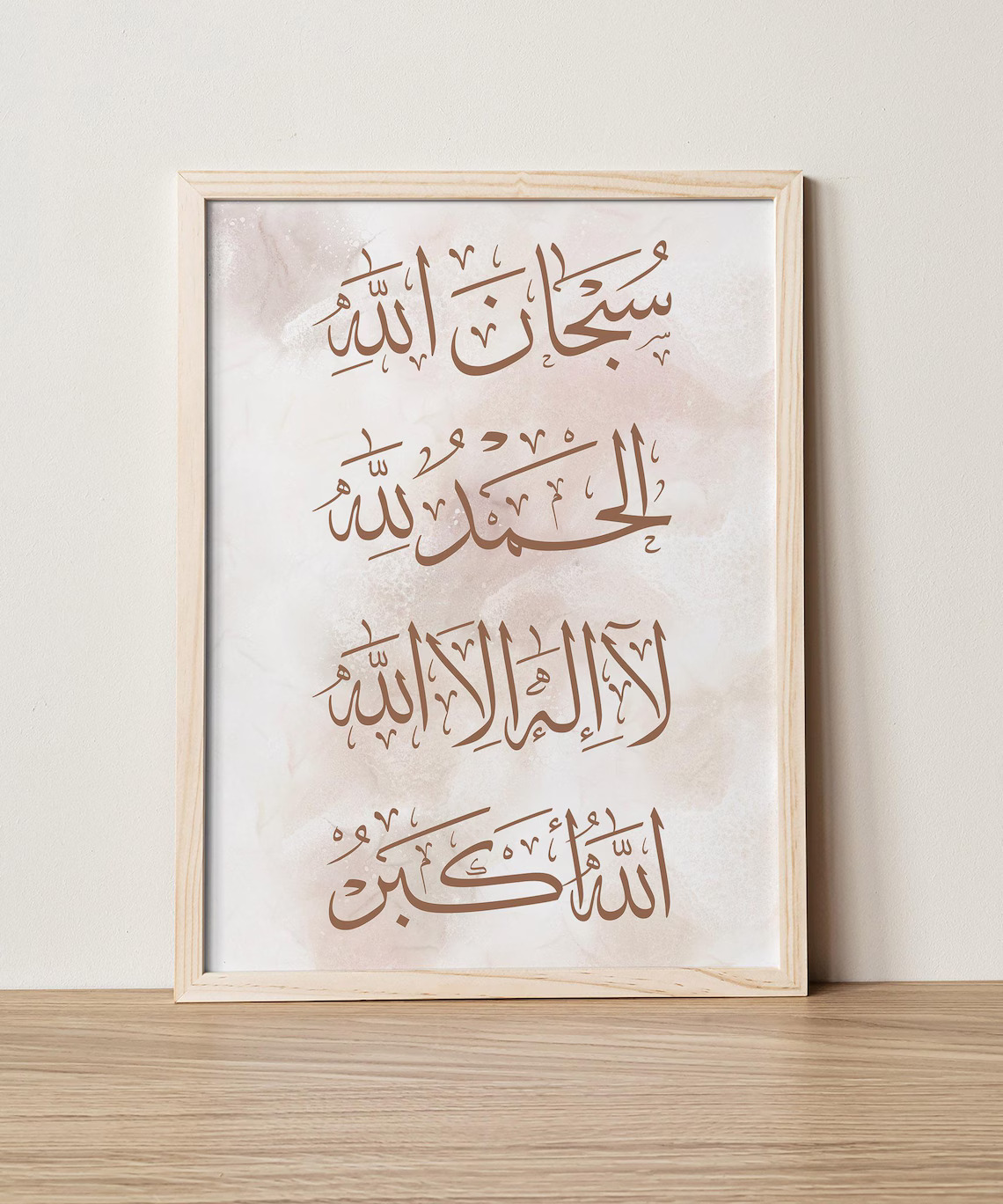 Our design team has carefully balanced traditional Thuluth-style calligraphy with a contemporary, minimalist aesthetic. Unlike traditional heavy gold or ornate frames, this piece features a clean, light wood finish that complements modern interior design trends. The background is a delicate blend of cream and tan watercolor textures, creating a "marble" effect that provides a soft, non-distracting canvas for the bold brown script.