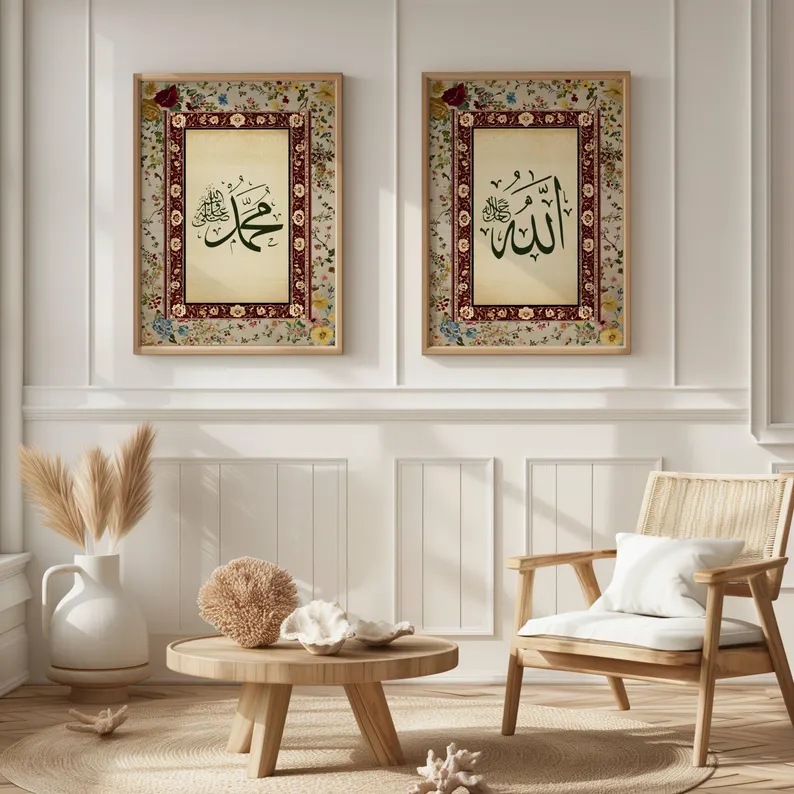 The Foundation of Dhikr The names of Allah and His Messenger, Muhammad (PBUH), are the spiritual anchors of a Muslim home. Our design presents these names in high-contrast, bold Arabic script. To aid in daily reflection, each frame includes a modern English translation at the bottom—"Allah is sufficient for me" and "Muhammad is the Messenger of Allah"—ensuring the message is accessible to all family members and guests.