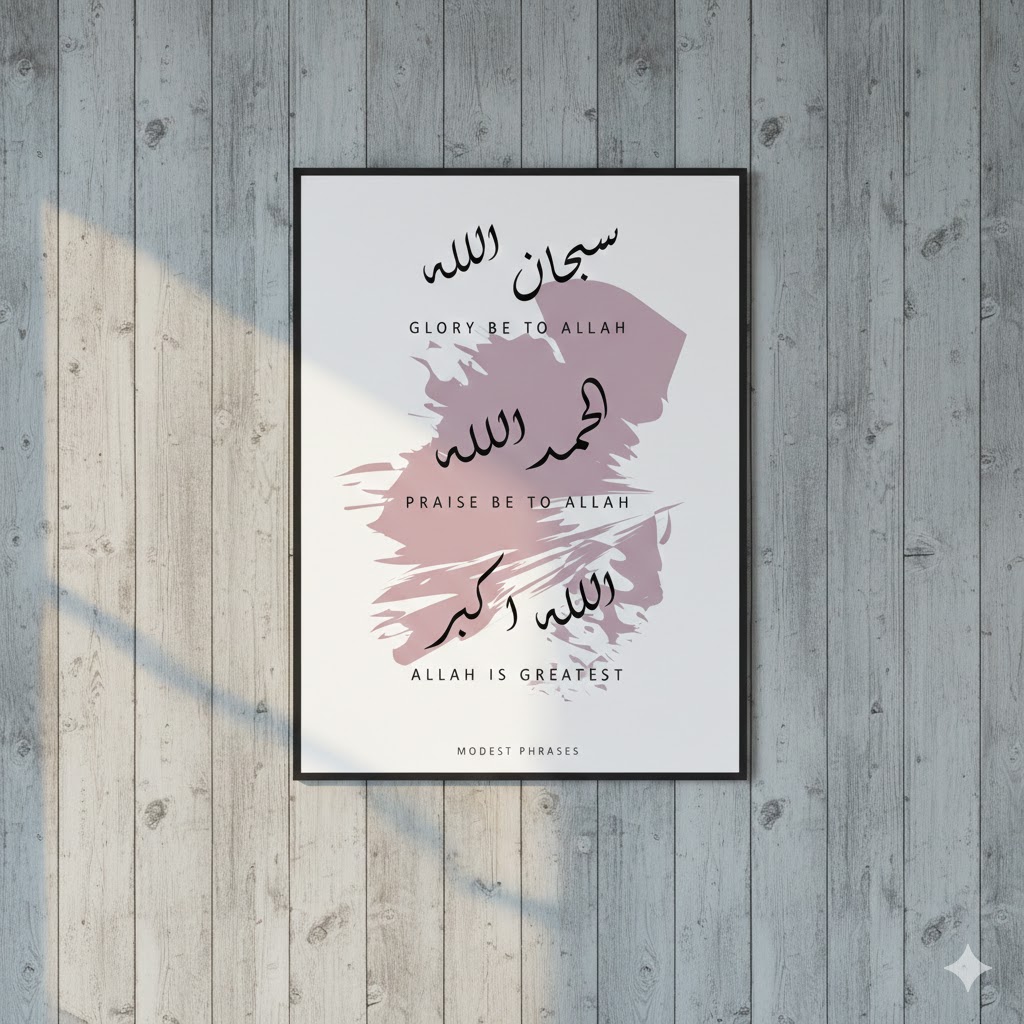 Transform your home or workspace into a sanctuary of peace and mindfulness with our Modest Phrases Islamic Calligraphy Canvas. This exquisite piece of art is more than just a decoration; it is a daily reminder of faith, gratitude, and the greatness of the Creator. Featuring the three "Tasbih" phrases—SubhanAllah (Glory be to Allah), Alhamdulillah (Praise be to Allah), and Allahu Akbar (Allah is Greatest)—this artwork serves as a spiritual anchor in the hustle and bustle of modern life.