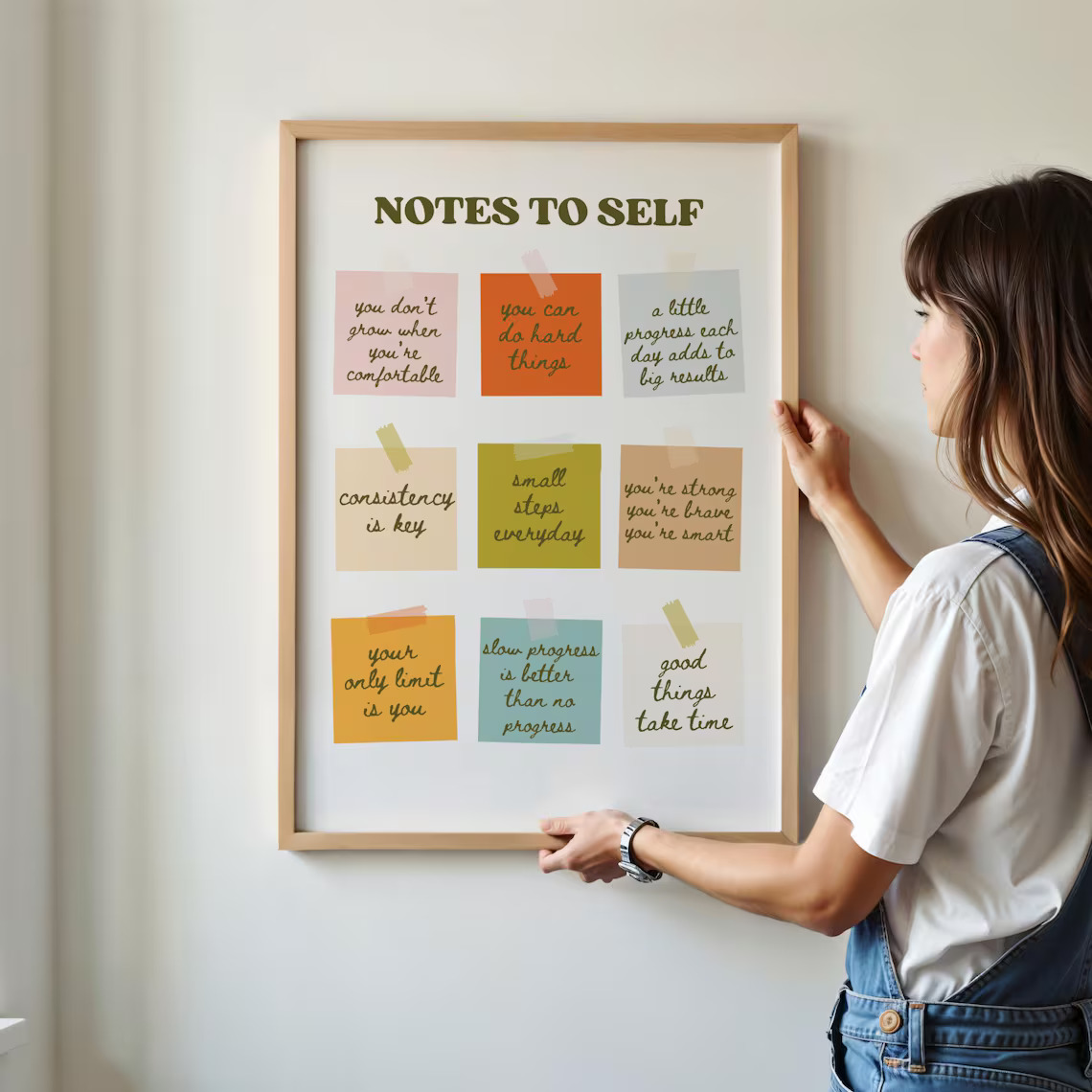 A Daily Dose of Kindness and Courage Transform your workspace or personal sanctuary into a hub of positivity with our "Notes to Self" wall art. We often forget to speak to ourselves with the same grace we offer others; this piece acts as a visual anchor, grounding you in the healthy habits and affirmations necessary for personal growth. It isn’t just a decoration—it’s a mindset captured in a frame.