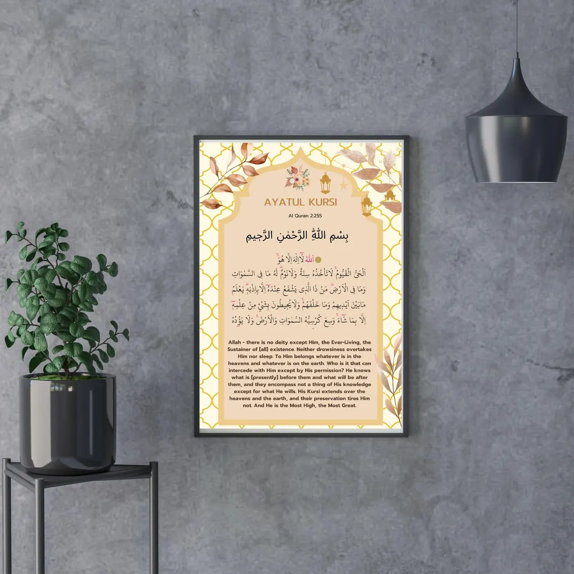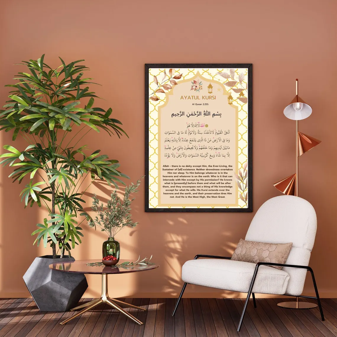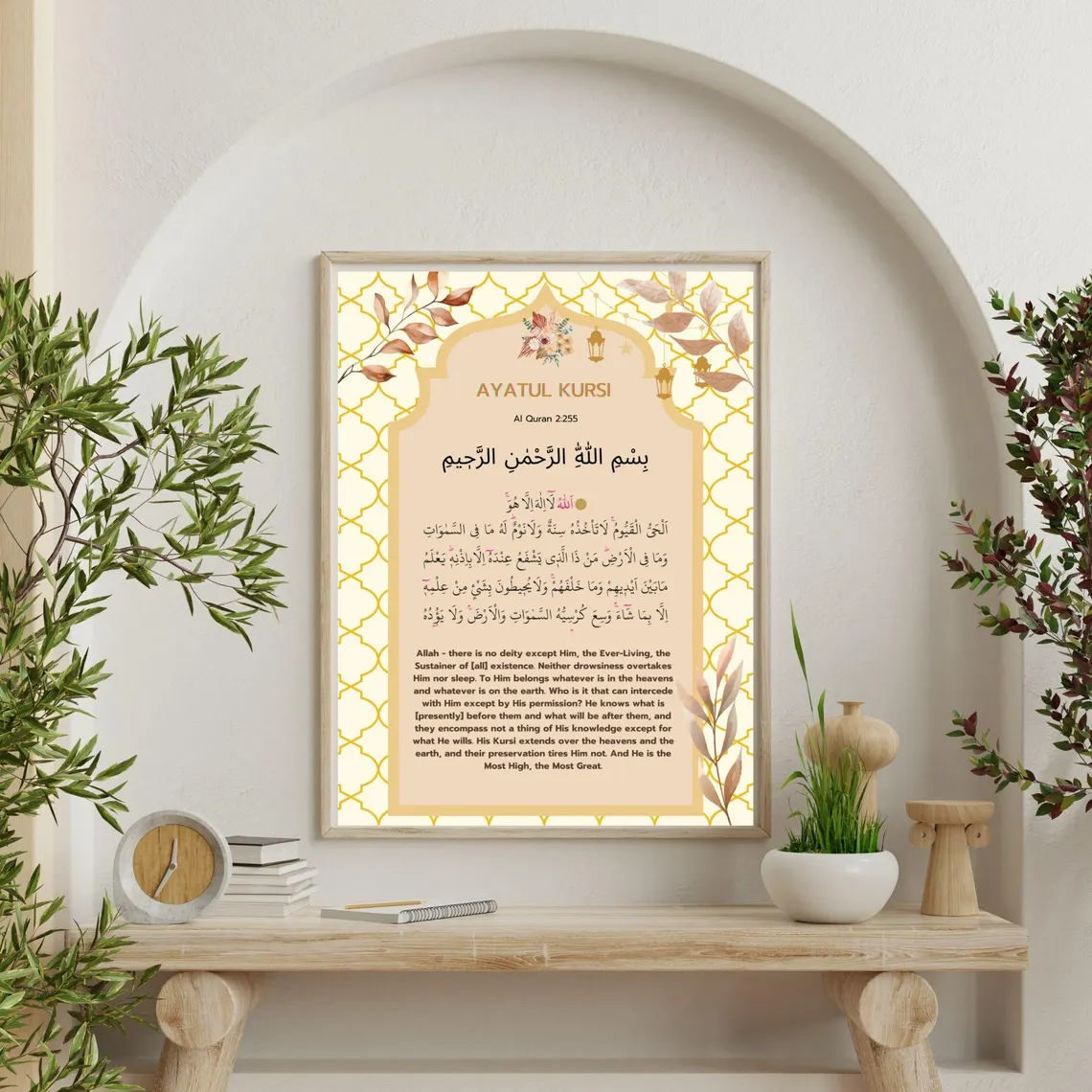 | Keywords | soft warm ayatul kursi frame, geometric islamic wall art, modern quran verse decor, neutral tone islamic calligraphy |