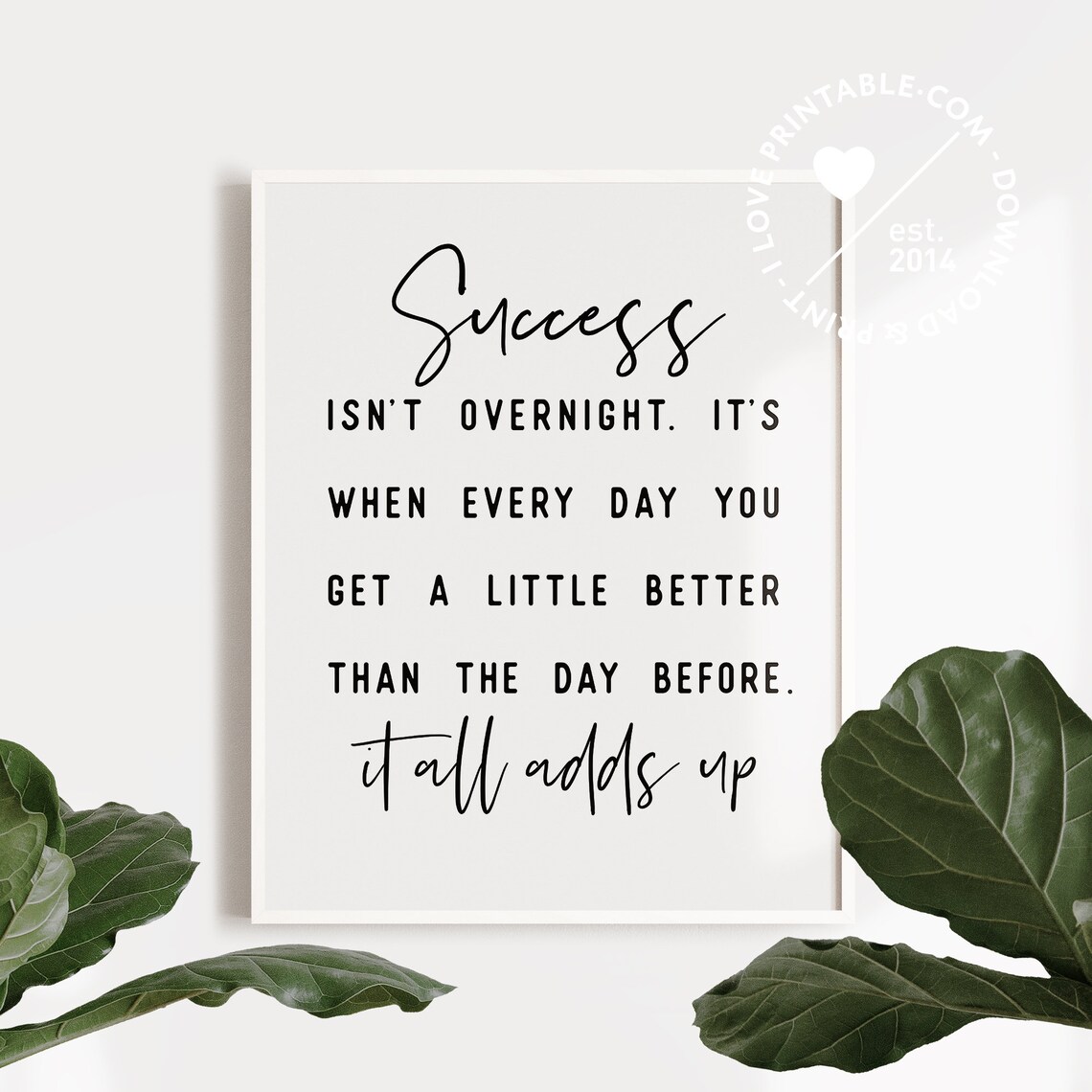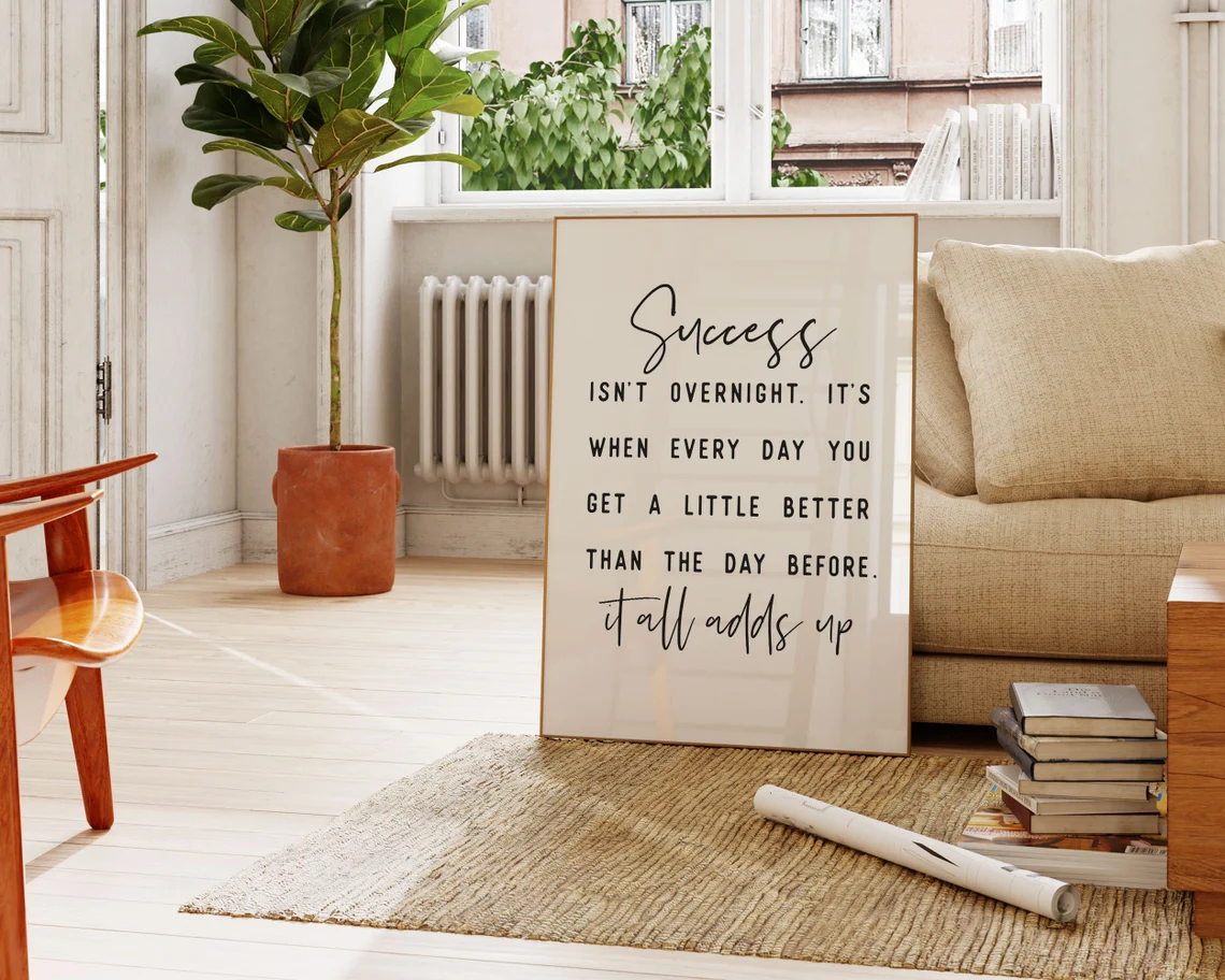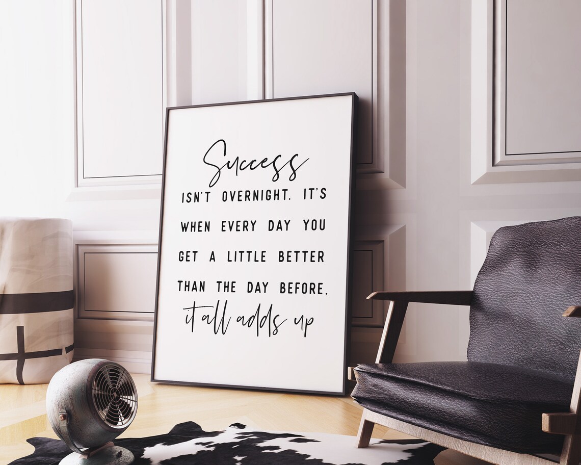 Elegant and Impactful Design This artwork features a sophisticated minimalist design that places the message front and center. Using a beautiful combination of clean, modern block lettering and elegant, hand-drawn script, the typography creates a balanced and professional aesthetic. The phrase "Success isn't overnight. It's when every day you get a little better than the day before. It all adds up" is rendered in deep black ink against a crisp white background. This high-contrast look ensures readability from across the room and makes it a striking addition to any wall.
