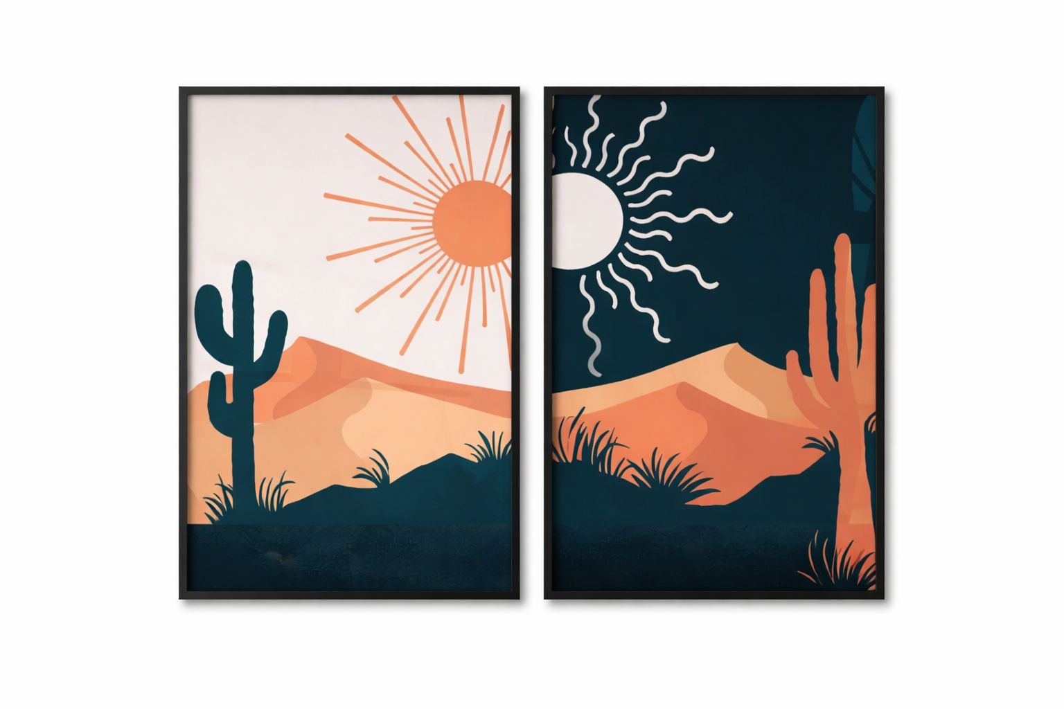 The Night (Moon): In direct contrast, the second piece features a deep, midnight-blue sky. A crisp white crescent moon hangs over a landscape of abstract mountains rendered in cool greys and muted blues. This piece is designed to evoke stillness, reflection, and the quiet beauty of the nocturnal world.