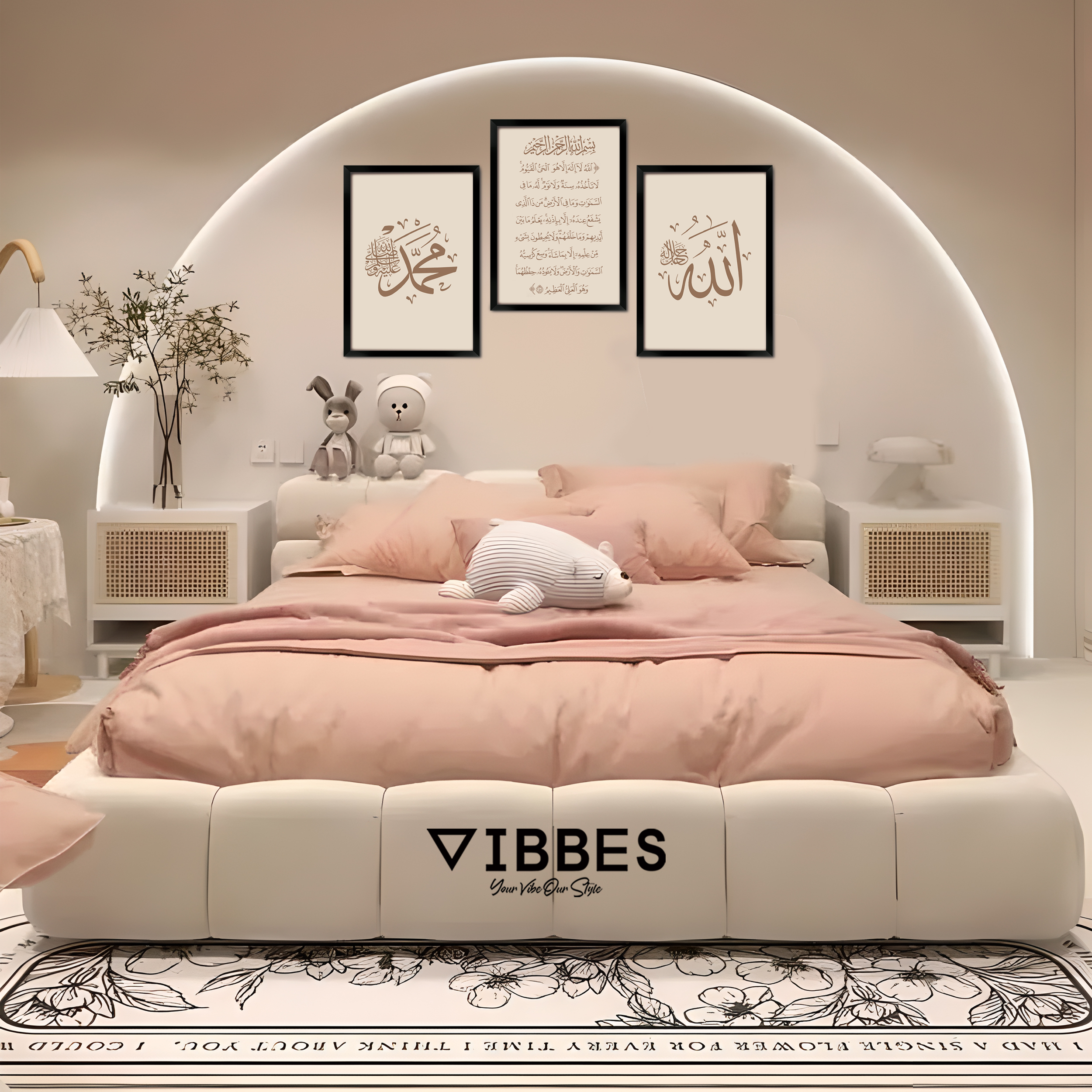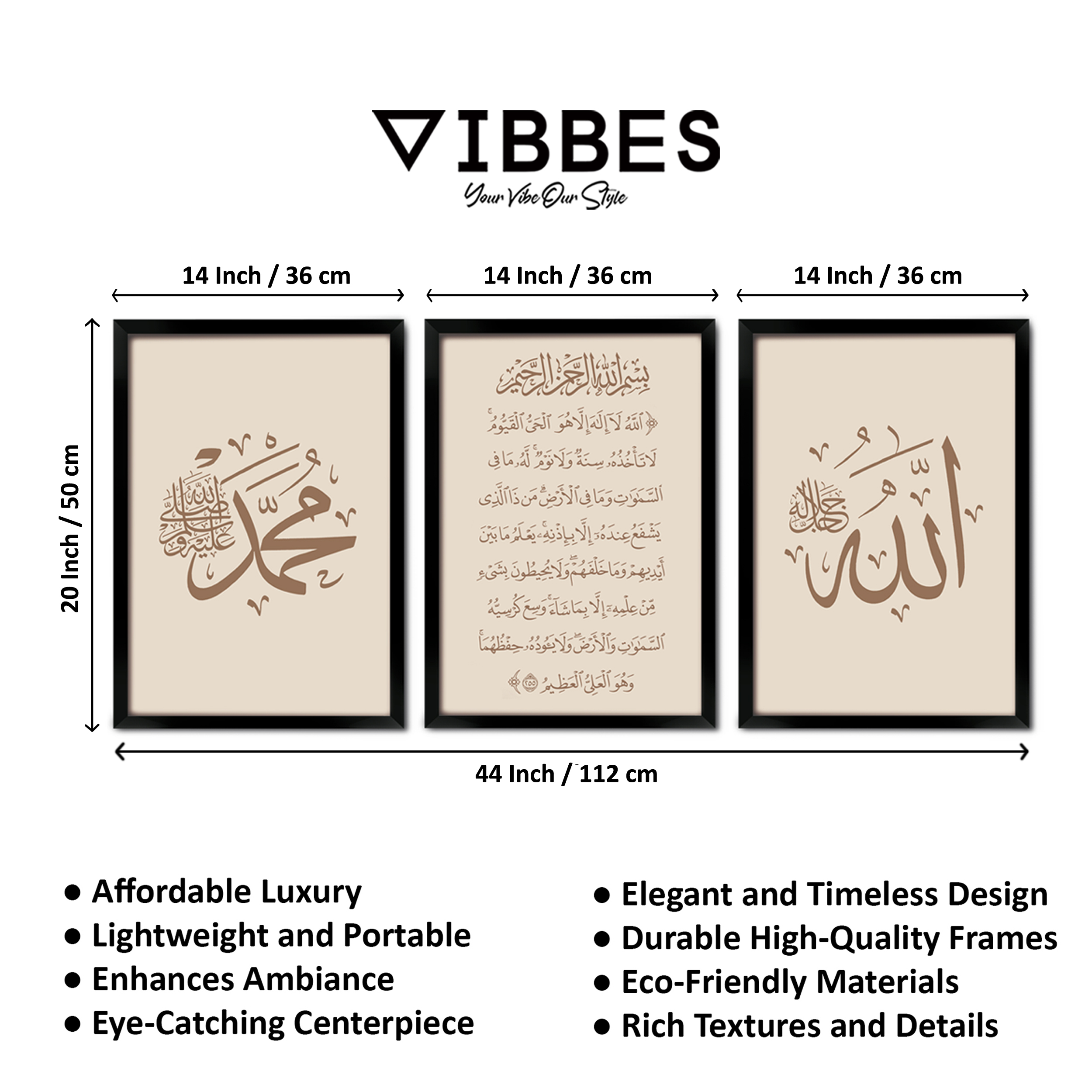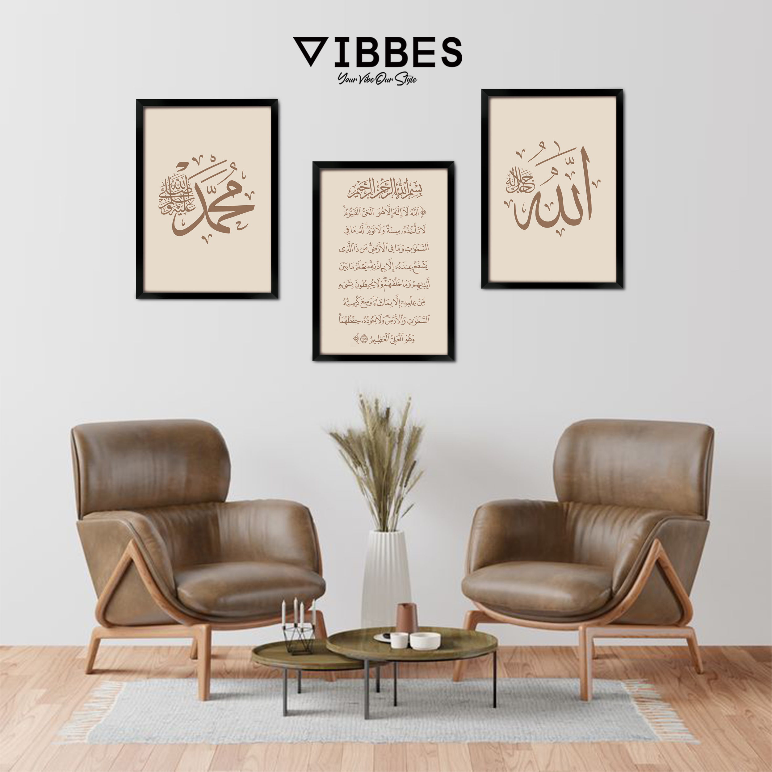 VIBBES wall art collections are crafted for premium quality, modern aesthetics, and meaningful spiritual decor.• Set of 3 Islamic wall art frames