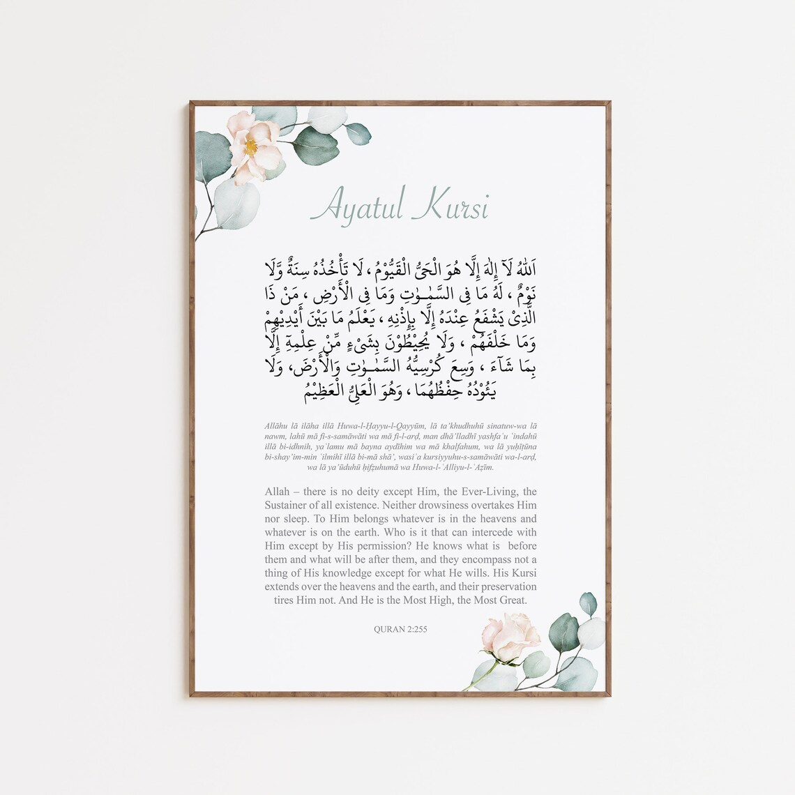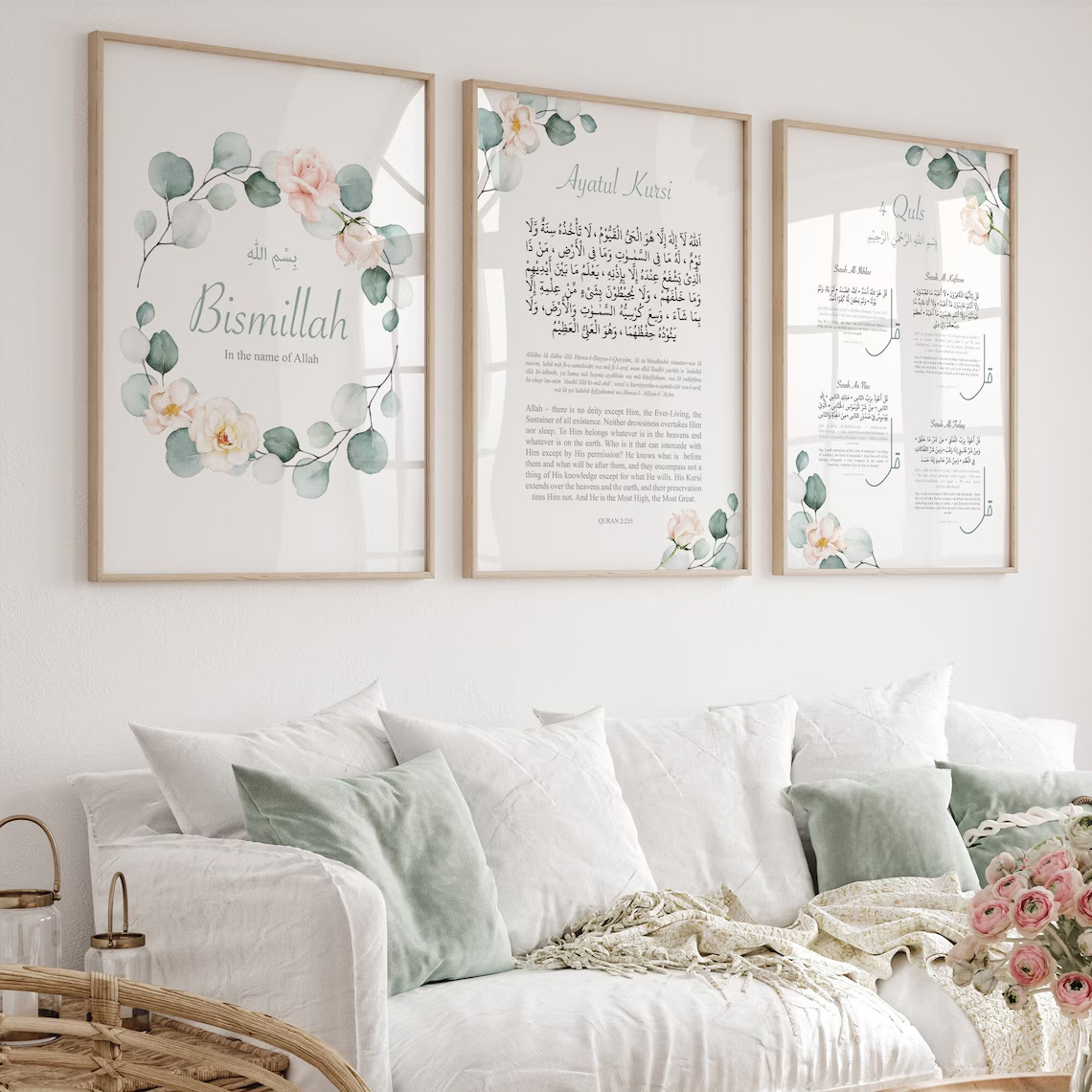 Enhance your home with spiritual elegance using this Islamic Floral Wall Art Set of 3 featuring Bismillah, Ayatul Kursi, and the 4 Quls. Designed with soft watercolor floral elements and elegant Islamic calligraphy, this wall art set brings peace, faith, and beauty to any space.
