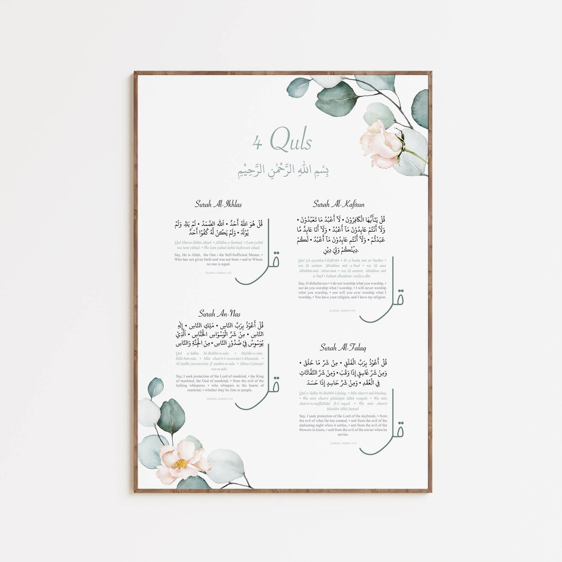 • islamic wall art set, bismillah frame, ayatul kursi wall art, 4 quls wall decor, muslim home decor, islamic calligraphy prints