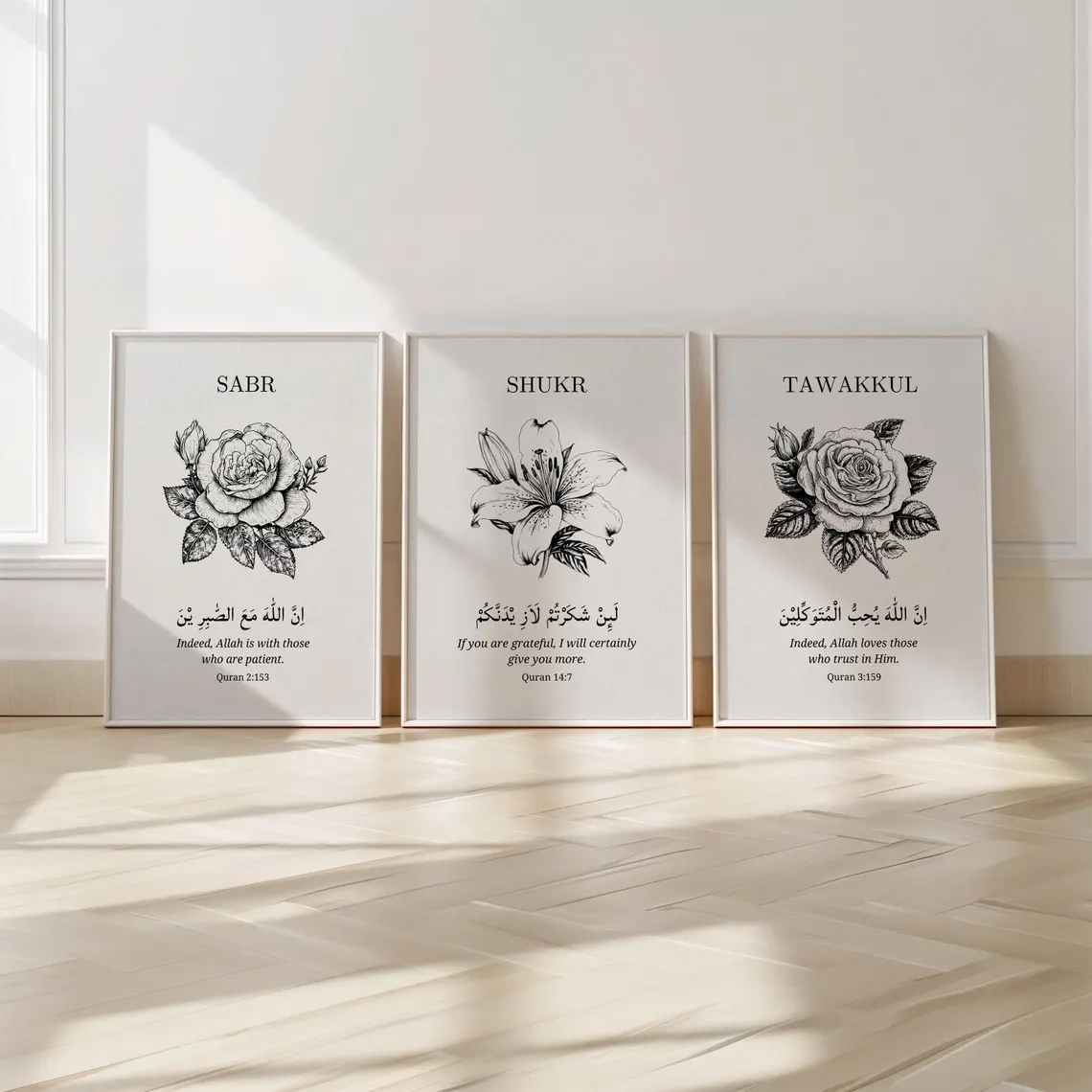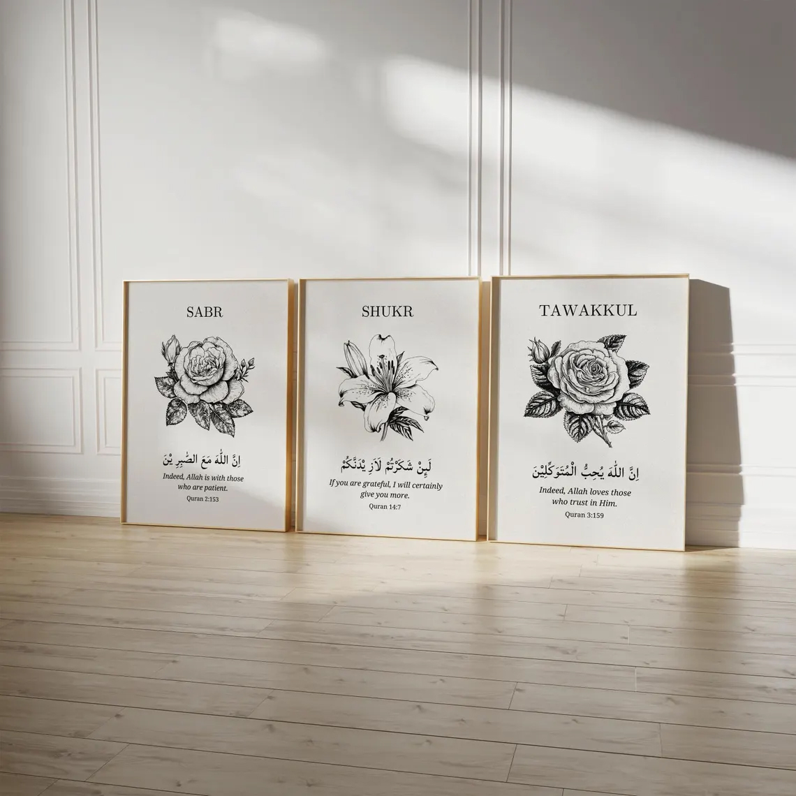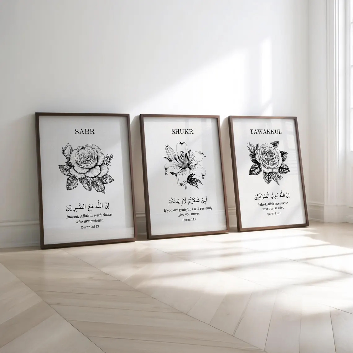 Sabr Shukr Tawakkul Floral Quran Verse Wall Art Set of 3 Minimal Black Sketch Frames