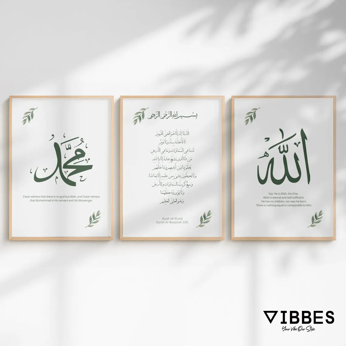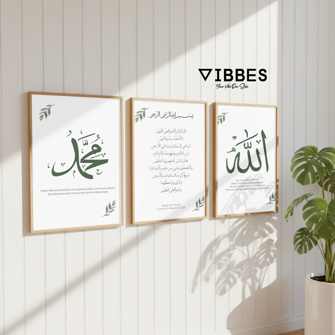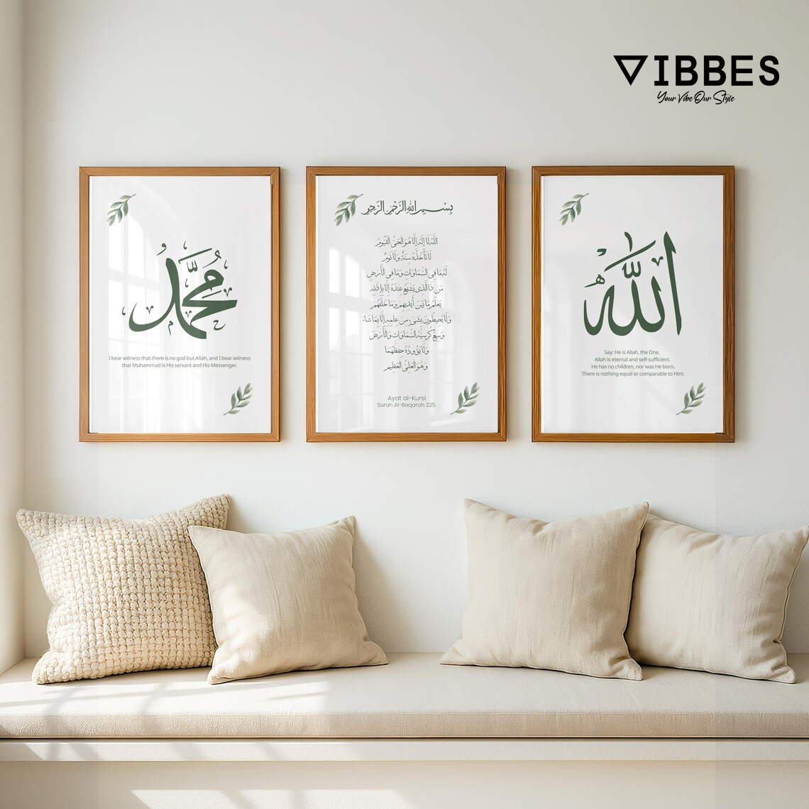 Enhance your home with this premium Islamic Wall Art Set of 3 featuring Allah, Muhammad, and Ayat-ul-Kursi in elegant Arabic calligraphy. Designed with a minimal modern aesthetic, the artwork features soothing green calligraphy on a clean white background with decorative leaf accents, making it perfect for contemporary and spiritual interiors.