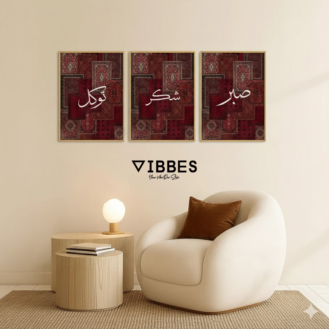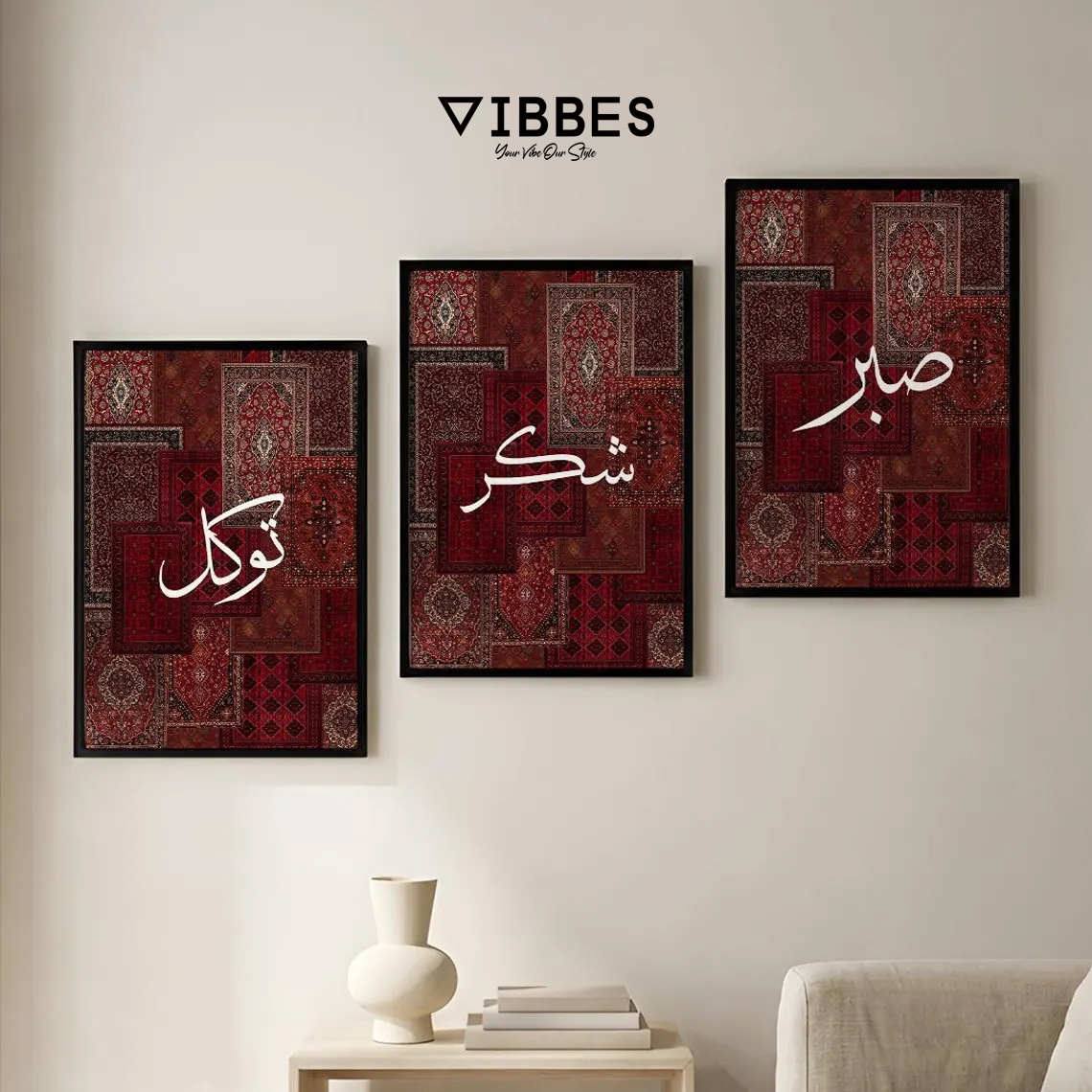 Islamic Tawakkul Shukr Sabr Patchwork Wall Art Set of 3 Red Theme