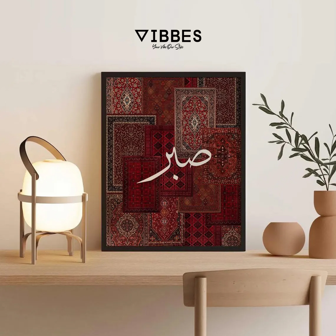 This premium Islamic wall art set of three features the beautiful Arabic words Tawakkul, Shukr and Sabr in a luxurious red patchwork carpet-inspired design. The artwork combines traditional Persian carpet motifs with modern geometric layouts to create a rich and elegant visual appeal.