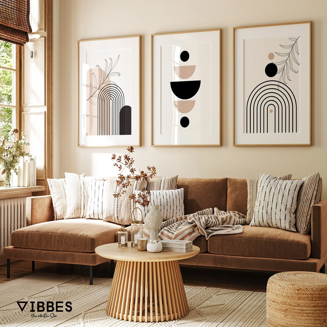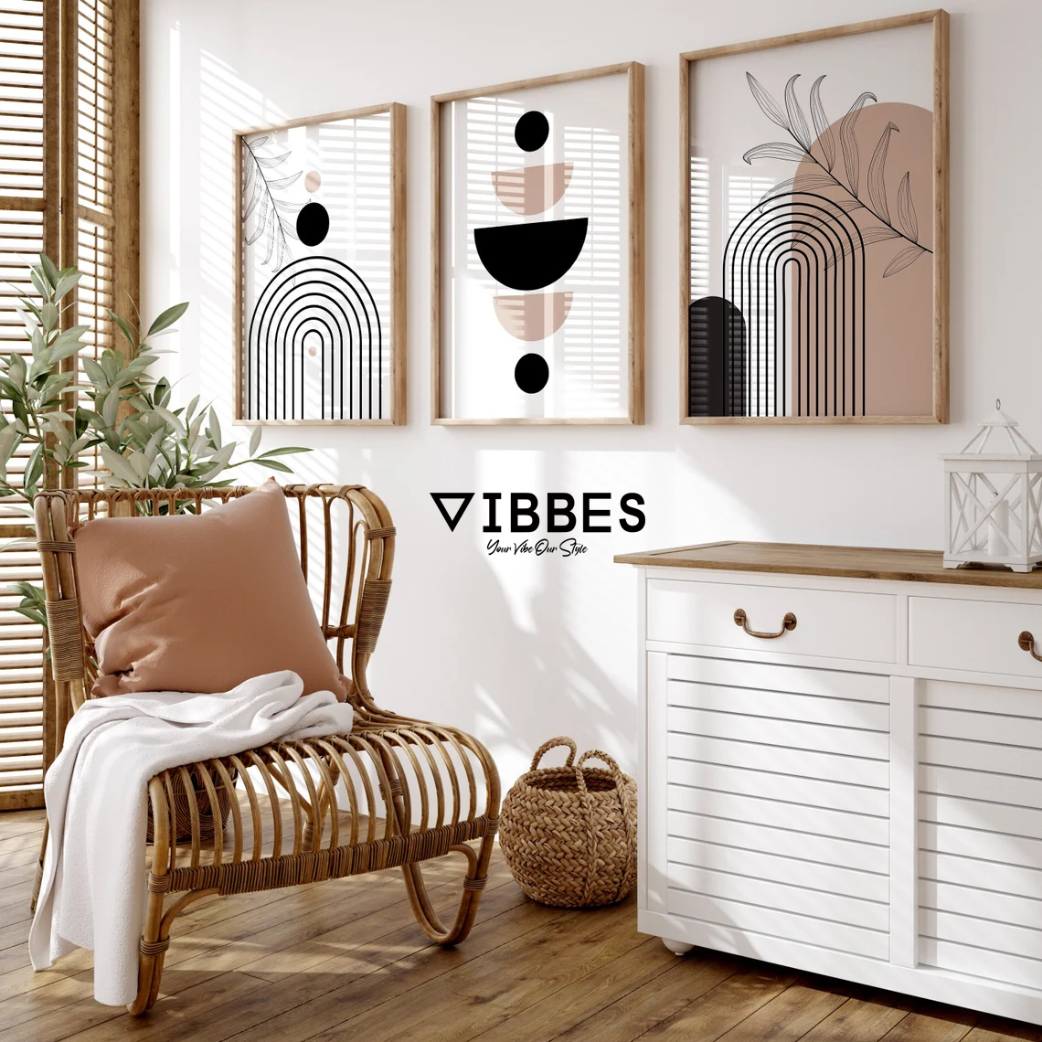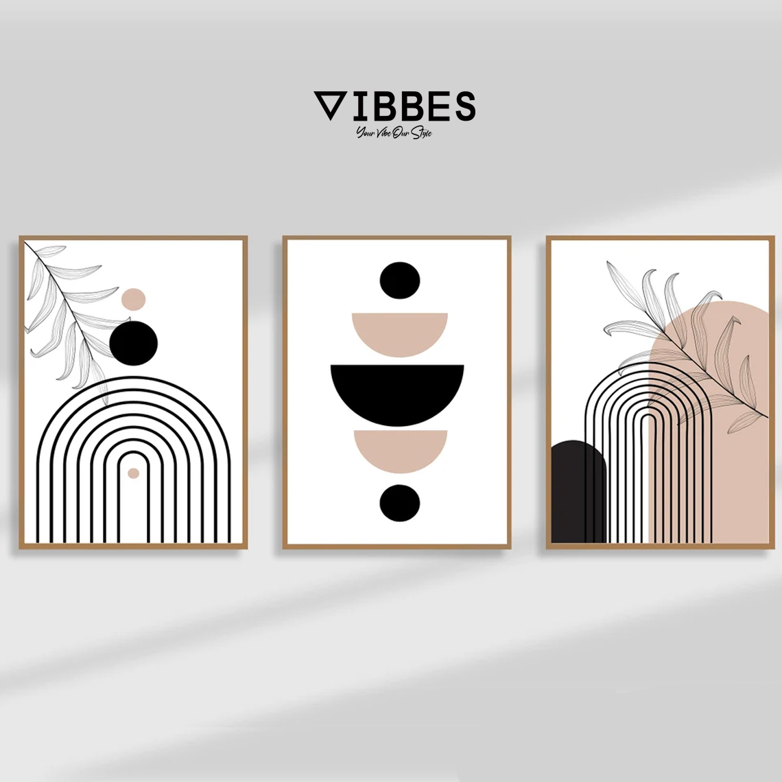 VIBBES Modern Abstract Geometric Botanical Wall Art Set of 3 Minimalist Beige Black Aesthetic Paintings