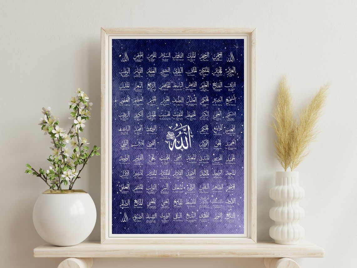 Modern Minimalist Framing To maintain its clean look, this artwork is housed in a minimalist light wood-finish frame. There are no ornate carvings or gold leafing here; instead, the straight lines and natural wood grain enhance the modern feel of the blue-and-white art. This simplicity ensures that the focus remains entirely on the sacred names and the beautiful celestial background.