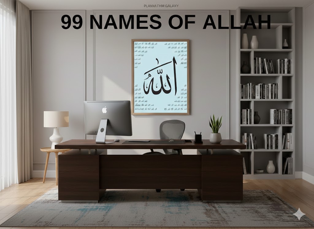 Artistic Contrast and Sophistication The soul of this artwork lies in its simplicity and contrast. The bold black Arabic calligraphy is expertly rendered, filling the frame with the primary name of the Creator. Surrounding the central script are smaller, elegant lines of poetic spiritual text, adding a layer of depth and traditional artistry to the layout. The sky-blue background acts as a canvas of peace, making the dark ink of the calligraphy appear sharp and clear.