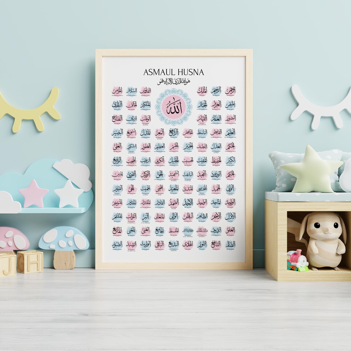 Create a serene and spiritually enriching environment for your little ones with our Asmaul Husna (99 Names of Allah) Kids Wall Art. More than just a decorative piece, this poster serves as a gentle daily reminder of the Divine attributes, designed specifically to blend seamlessly into the modern nursery, playroom, or bedroom.