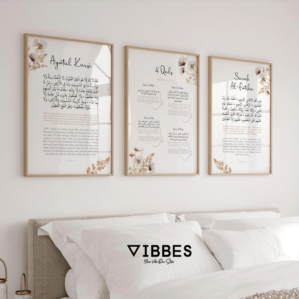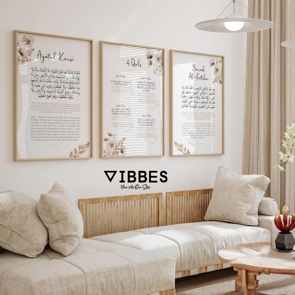 Bring peace and spirituality into your home with the Vibbes Islamic Wall Art Set of 3 featuring Ayatul Kursi, 4 Quls, and Surah Al-Fatiha in an elegant floral minimalist design. This beautiful Quran verse wall art set is perfect for Muslim homes, bedrooms, prayer rooms, living rooms, and offices.