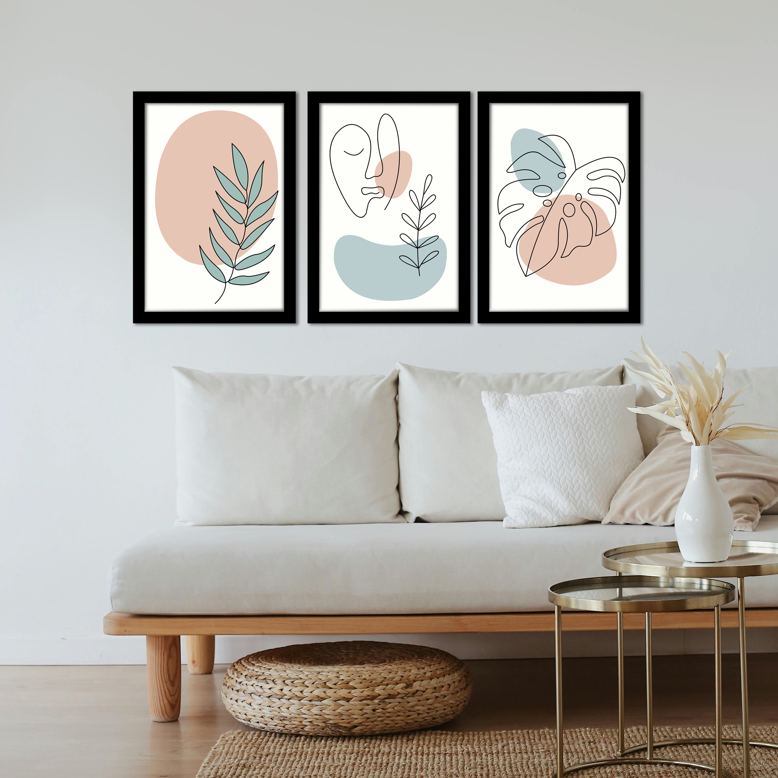 Vibbes Modern Abstract Line Art Wall Art Set of 3 | Minimal Face & Botanical Leaf Design | Black Frame with Fibre Glass