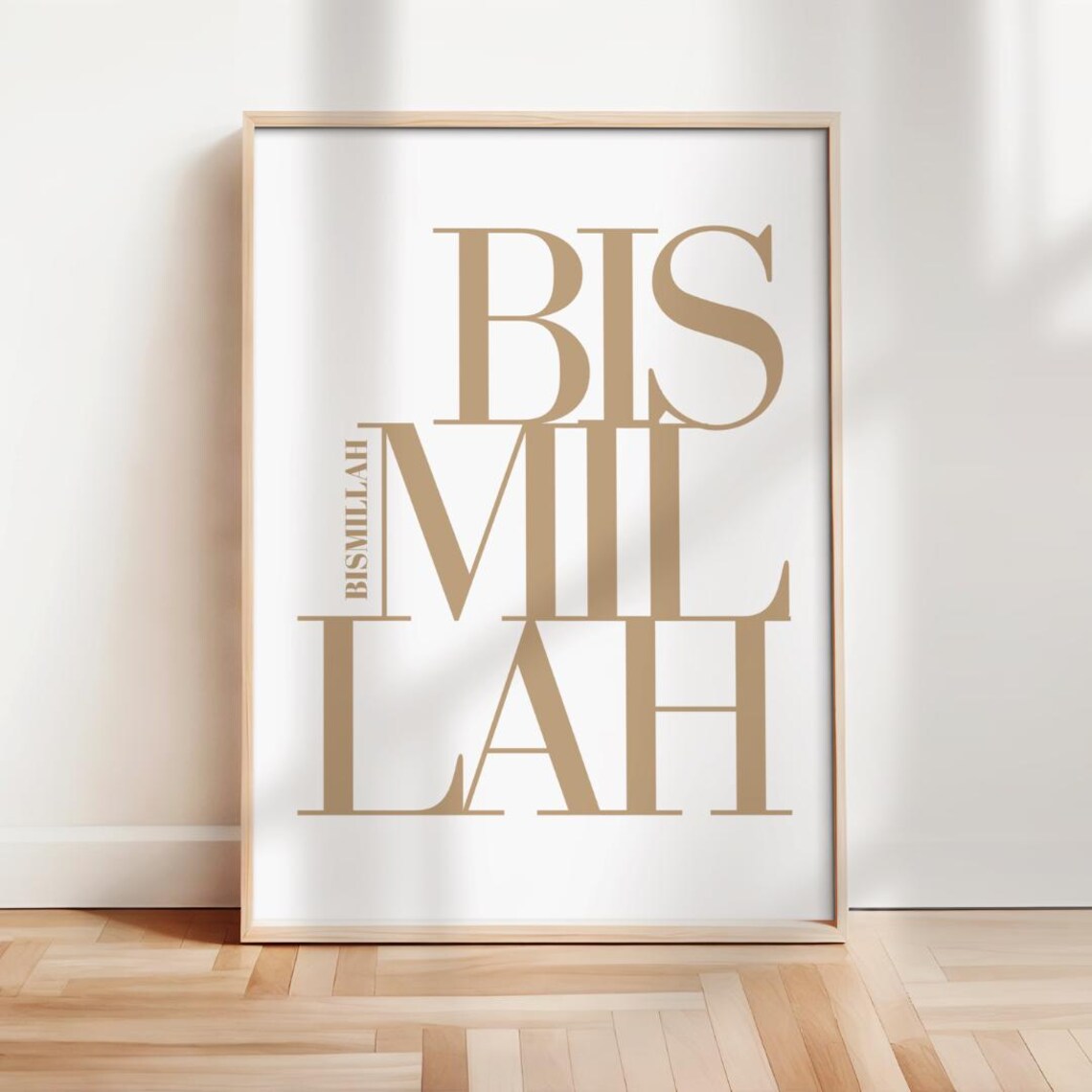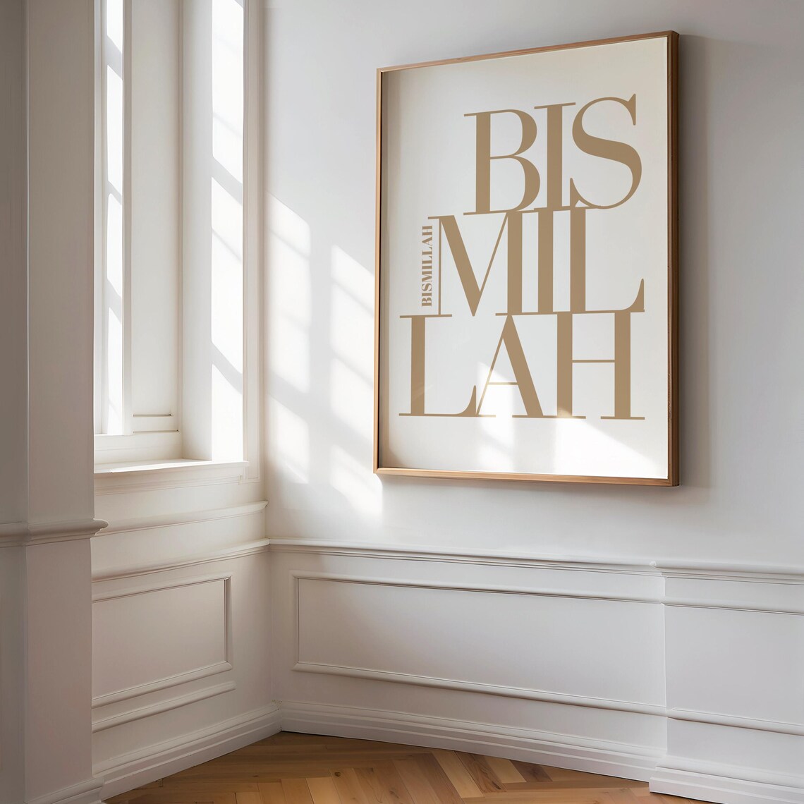 • bismillah wall art, bismillah typography frame, modern islamic wall art, minimalist islamic decor, muslim home decor wall art, bismillah modern art, islamic typography poster, contemporary islamic decor, neutral islamic wall art, luxury islamic wall frame