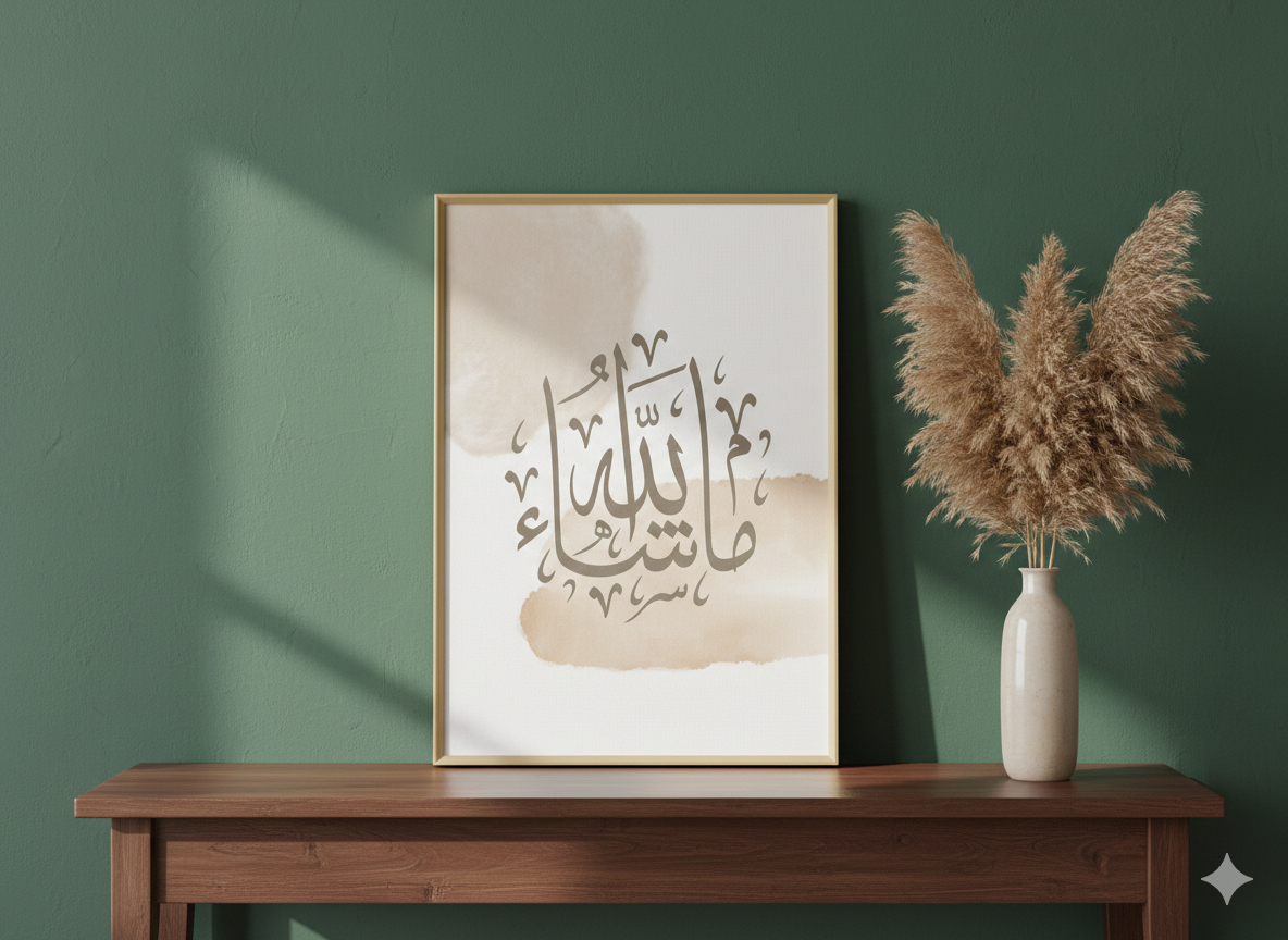 Masha Allah Islamic Calligraphy Wall Frame is a beautiful expression of faith and gratitude, designed to add peace and elegance to your home. Featuring refined Arabic calligraphy with a soft, neutral aesthetic, this artwork blends seamlessly with modern, minimalist, and contemporary interiors.