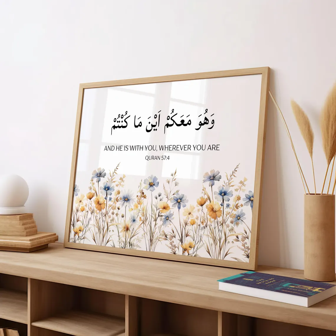Bring a profound sense of comfort and security into your living space with our Divine Presence Frame. This stunning horizontal piece features one of the most reassuring verses in the Holy Quran: "And He is with you wherever you are" (Surah Al-Hadid, 57:4). Designed as a modern spiritual anchor, this frame serves as a constant reminder that you are never truly alone, grounding your heart in the omnipresence and mercy of the Creator.