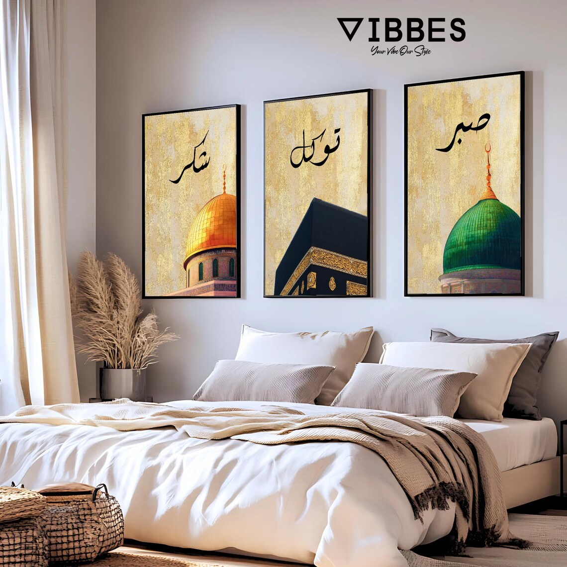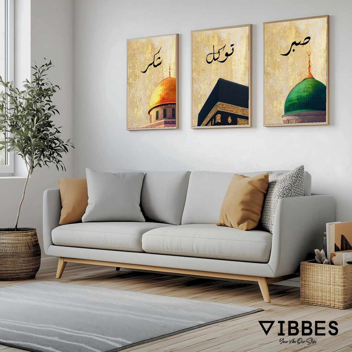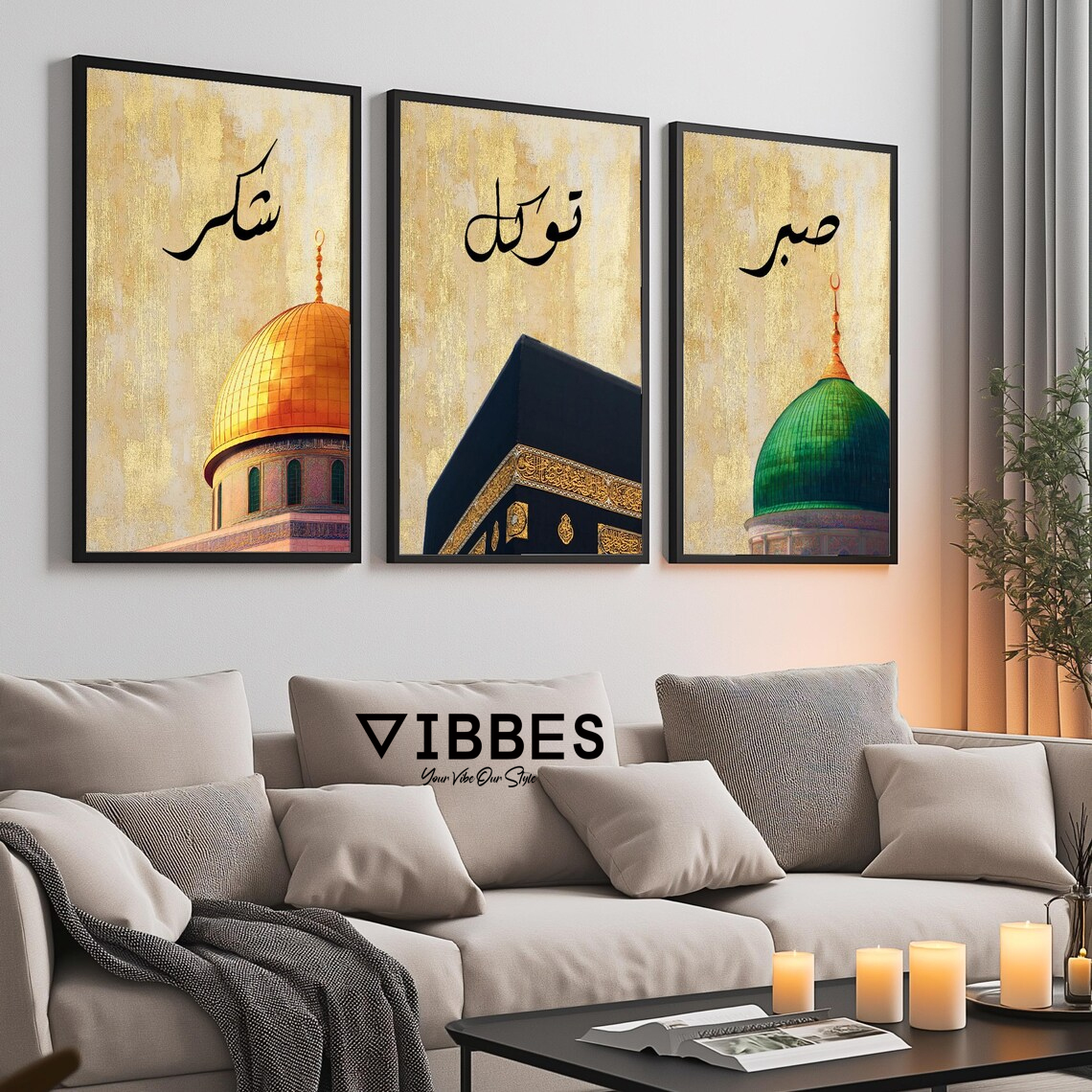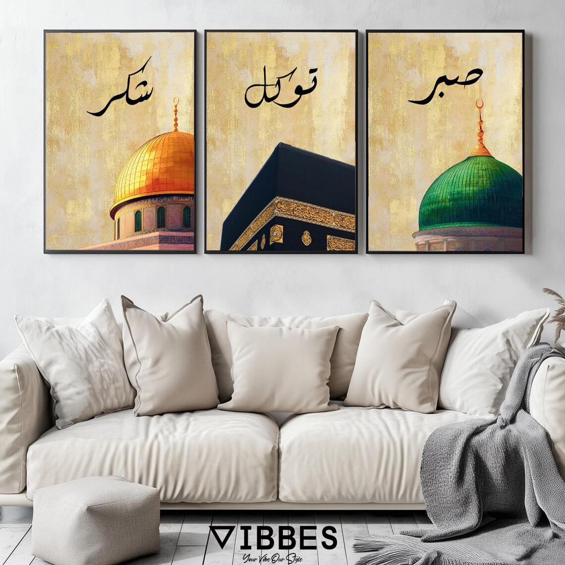 Bring faith, patience, gratitude, and complete trust in Allah into your living space with our Sabr Shukr Tawakkul Islamic Wall Art Set, a beautifully curated collection that blends powerful Islamic values with iconic holy places. This elegant three-piece wall art set features the Arabic calligraphy of Sabr (Patience), Shukr (Gratitude), and Tawakkul (Trust in Allah), paired with visually stunning representations of sacred Islamic landmarks.