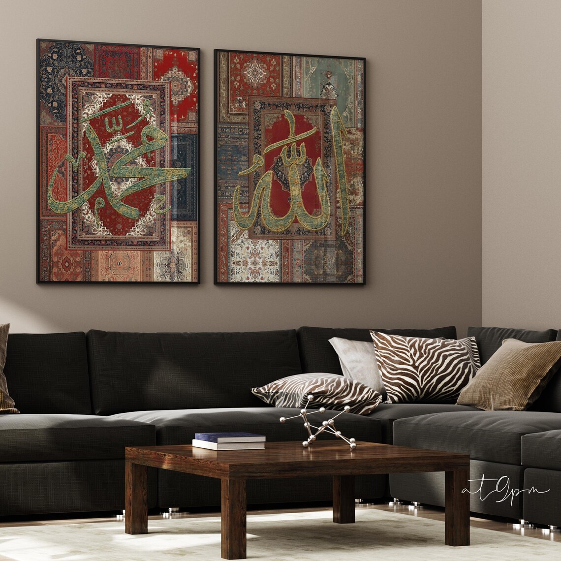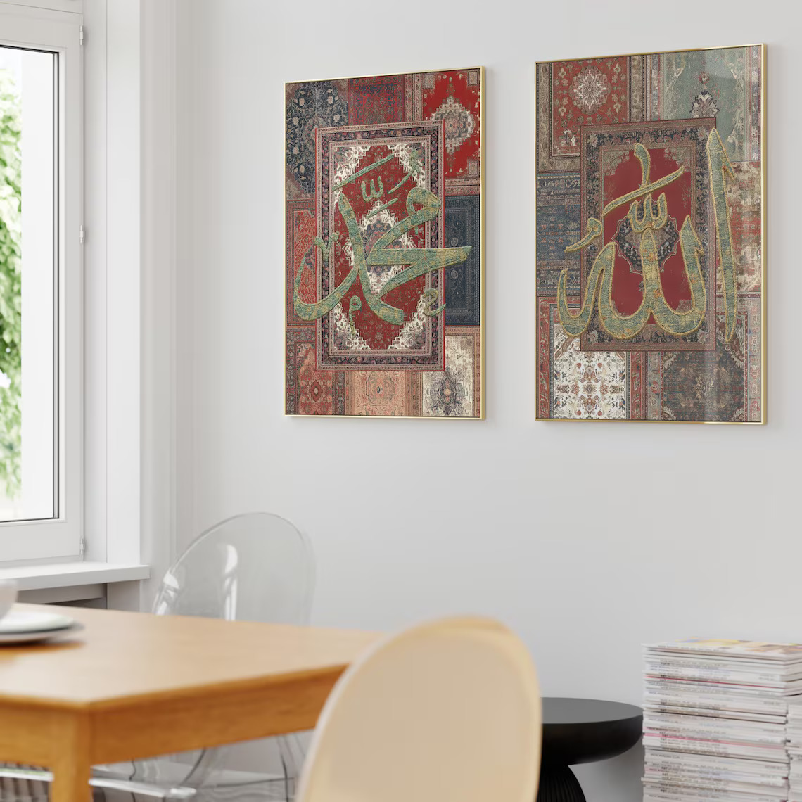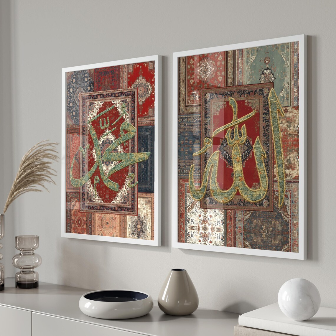 The Allah & Muhammad Heritage Rug Series Infuse your home with the warmth, color, and history of the Islamic world with our Allah & Muhammad Heritage Rug Series. This exquisite set of two frames is a tribute to the legendary craftsmanship of Arabic and Persian weavers, blending the sacred names of Allah and His Messenger (PBUH) with the intricate, soulful patterns of traditional handmade rugs. Designed for the modern home that celebrates cultural roots, this collection brings a "vintage-modern" aesthetic that is both spiritually grounding and visually spectacular.