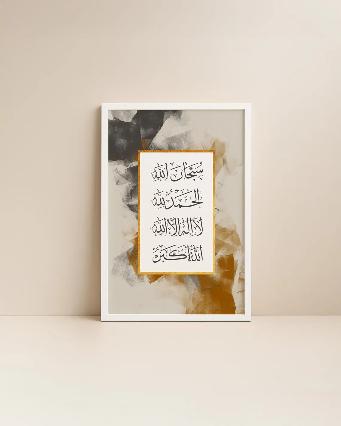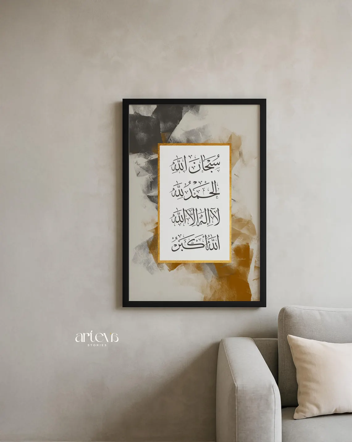 Classic Calligraphy with Modern Clarity Within the gold-bordered center, the four essential phrases of remembrance are rendered in fluid, black Arabic script: