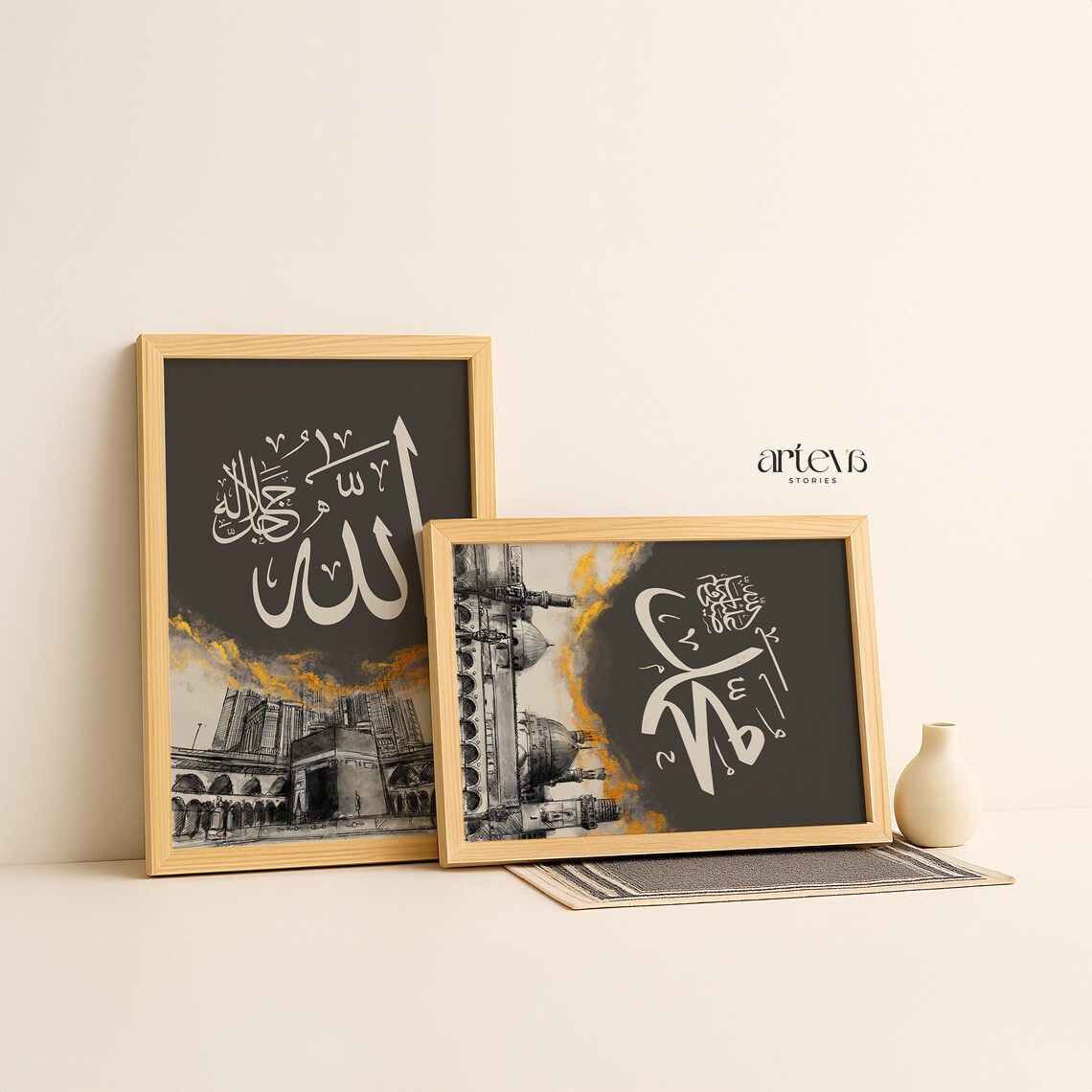The Architectural Sketch Series Invite the spiritual essence of the two holiest sites in Islam into your home with our Allah & Muhammad Architectural Sketch Series. This collection is a beautiful fusion of sacred calligraphy and architectural artistry, designed for those who wish to keep the memory of Makkah and Madinah alive in their daily environment. Featuring detailed, hand-drawn style sketches of the Kaaba and Masjid an-Nabawi, this set provides a profound visual connection to the heart of the Muslim world.