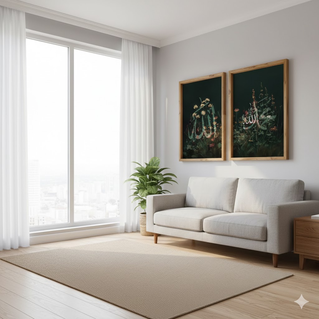 : The Dark Botanical Collection Invite a sense of sophisticated mystery and deep spiritual tranquility into your home with our Allah & Muhammad Dark Botanical Shadow Duo. This unique set is a masterpiece of contrast and light, meticulously designed for the modern home that values bold, artistic aesthetics paired with profound spiritual meaning. By utilizing a deep, solid black background, this design allows the sacred names of Allah and His Messenger (PBUH) to emerge with a radiant, luminous quality that captures the eye and grounds the heart.