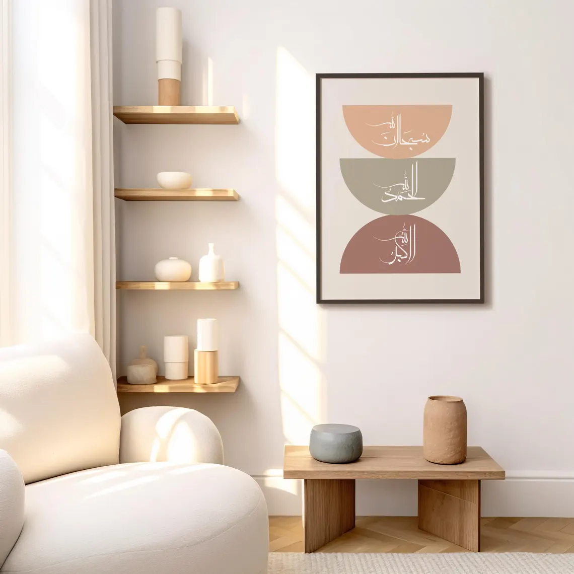 Modernity Meets Spirituality Our "Aura Dhikr" series represents a sophisticated shift in Islamic wall decor. Designed for the modern aesthetic, this piece departs from traditional ornate borders and instead embraces a clean, geometric abstract style. The artwork centers around three balanced semi-circles in a harmonious palette of soft terracotta, muted sage, and warm mauve. Each shape serves as a foundation for elegant, flowing Arabic script representing the essential phrases of remembrance: SubhanAllah, Alhamdulillah, and Allahu Akbar.