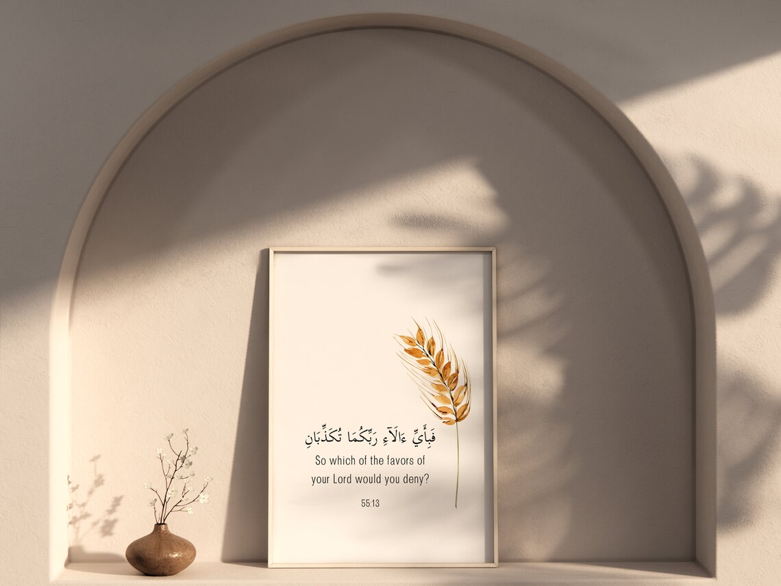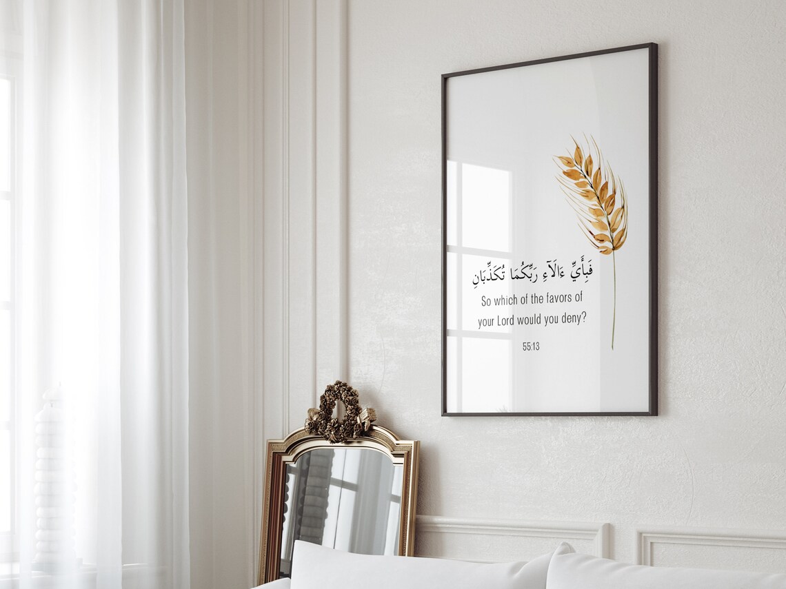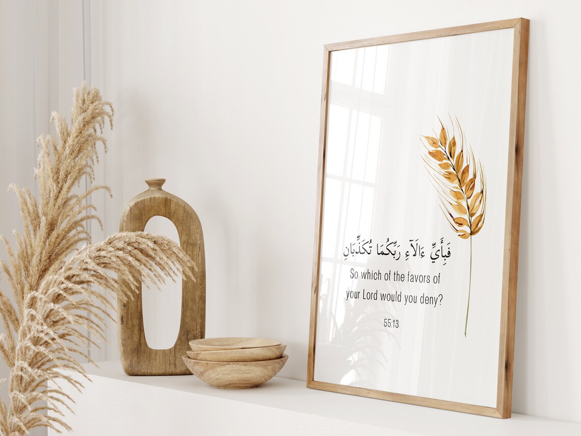 A Timeless Reminder of Infinite Blessings Cultivate a spirit of gratitude (Shukr) in your home with our "Botanical Gratitude" framed art. This elegant piece features the iconic and rhythmic refrain from Surah Ar-Rahman (55:13): "So which of the favors of your Lord would you deny?" It is a verse that invites deep reflection on the countless visible and invisible blessings bestowed upon us, serving as a gentle nudge to remain thankful in every state of life.