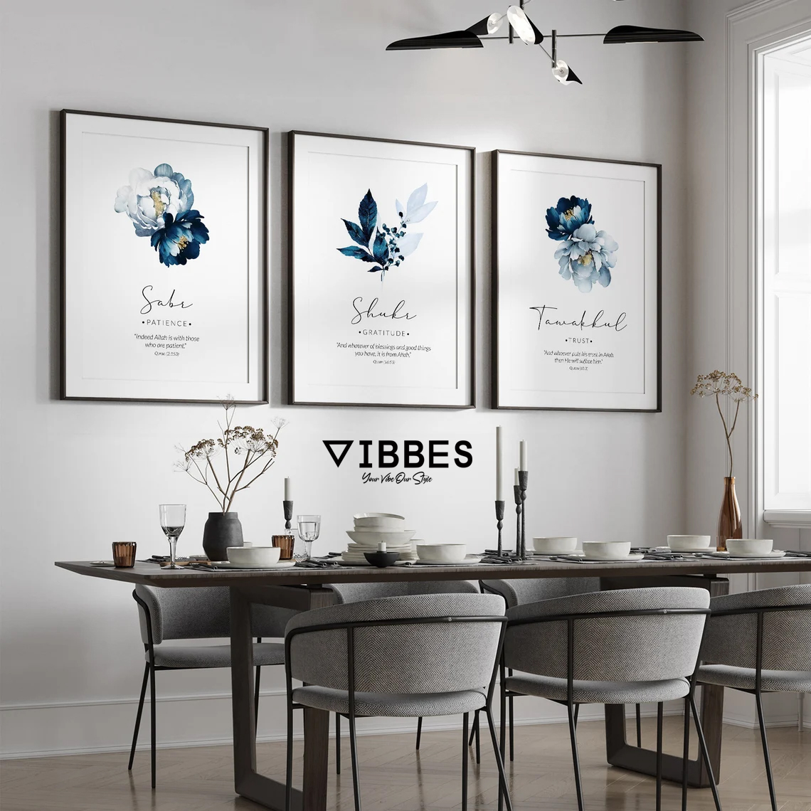 This elegant Islamic wall art set of three features the beautiful words Sabr, Shukr and Tawakkul with soft floral artwork in a calming blue theme. The modern minimal design makes it perfect for contemporary homes, apartments and spiritual spaces.