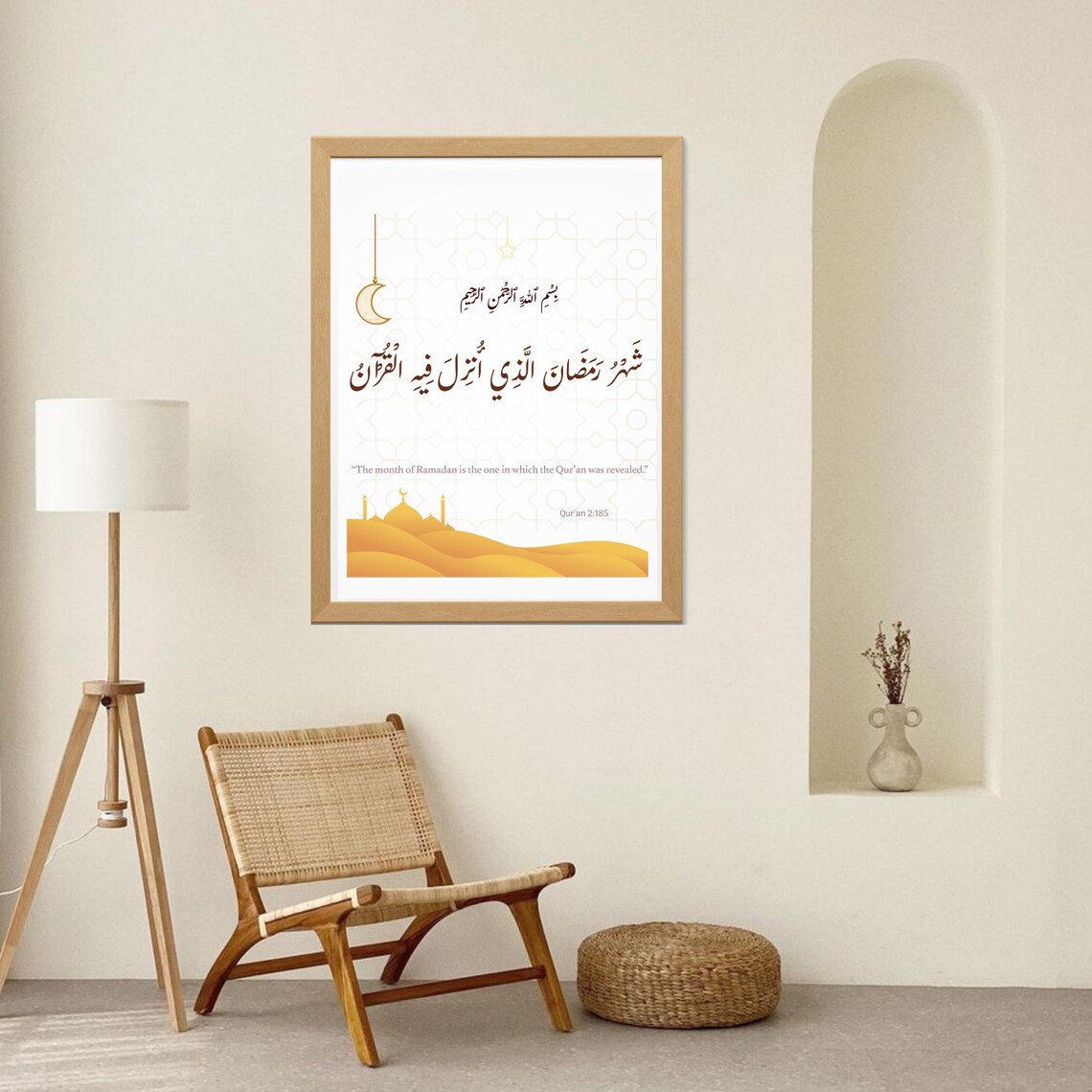 Contemporary Square Framing: Housed in a natural light-wood frame, the square format offers a modern look that fits perfectly in entryways, living rooms, or dining areas where the family gathers for Iftar.