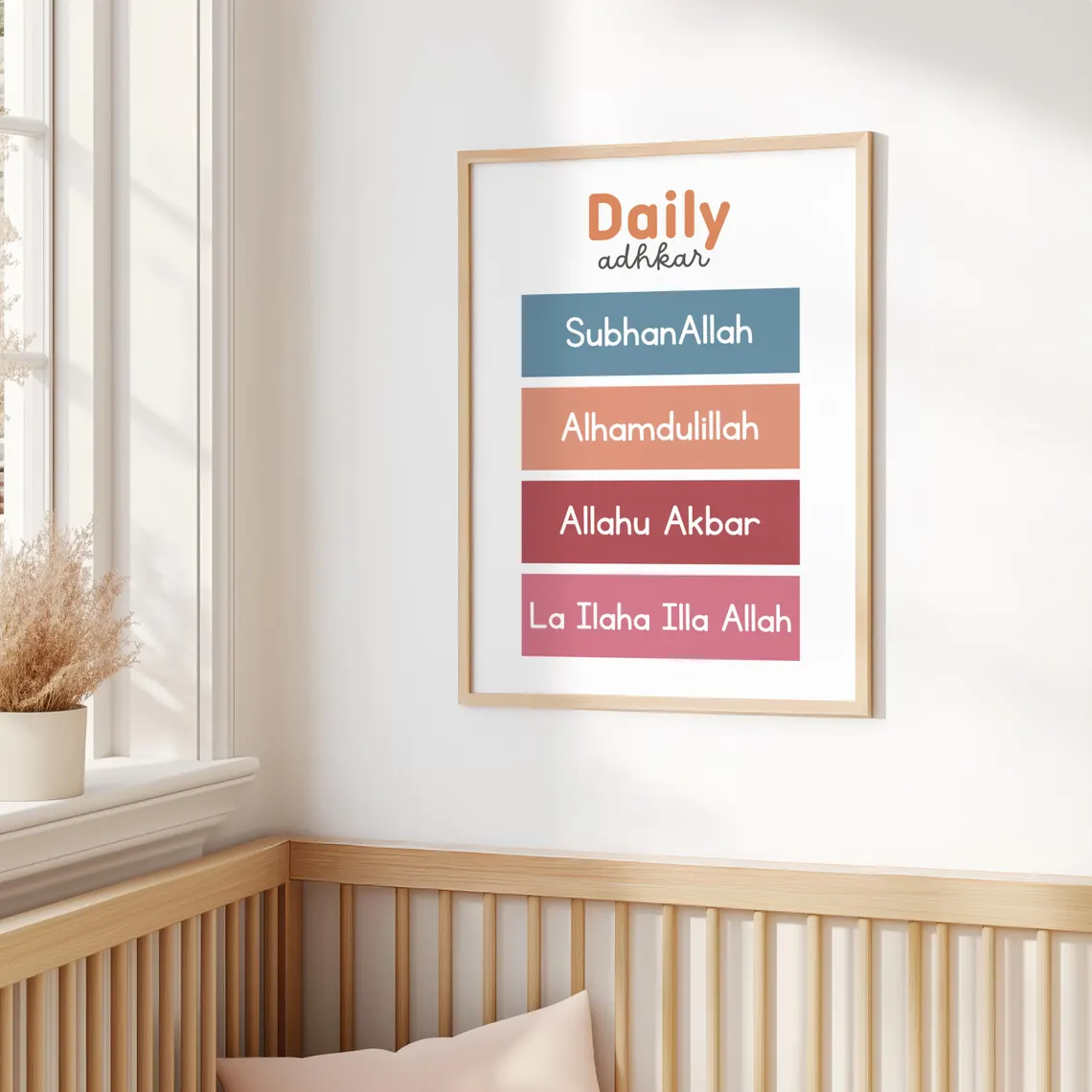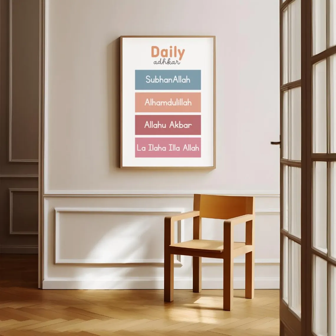 Design Philosophy: Clarity and Sophistication Unlike traditional children's decor, this piece utilizes a structured, block-style layout that appeals to both young children and style-conscious parents. The "Daily Adhkar" title is presented in a friendly, modern font at the top. Below, each sacred phrase is set within a solid color block—slate blue, muted terracotta, dusty rose, and soft mauve—creating a calm and orderly visual flow. This sophisticated palette allows the artwork to grow with your child, looking just as appropriate in a teenager's study as it does in a newborn's nursery.