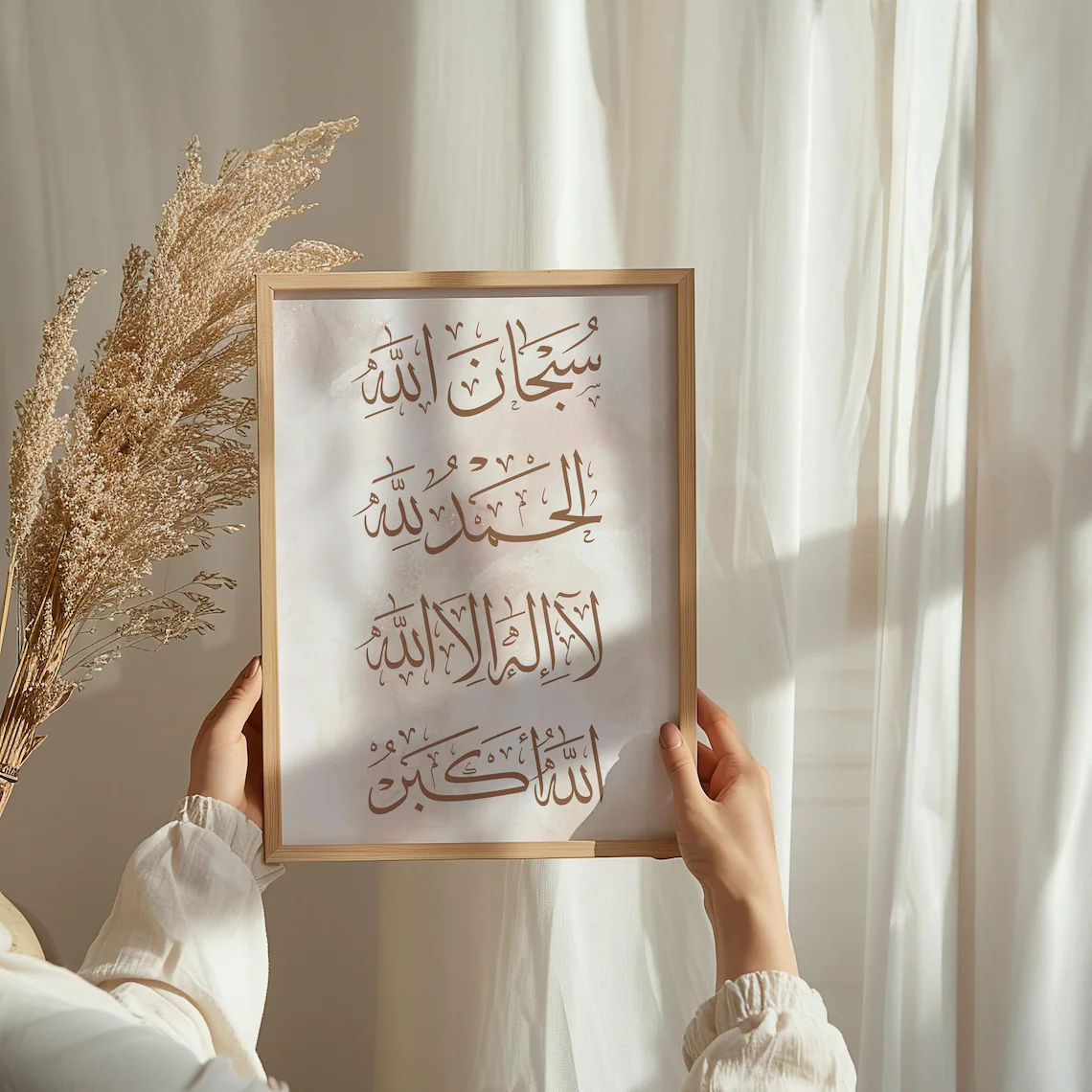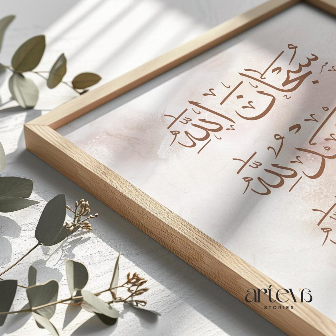 Our design team has carefully balanced traditional Thuluth-style calligraphy with a contemporary, minimalist aesthetic. Unlike traditional heavy gold or ornate frames, this piece features a clean, light wood finish that complements modern interior design trends. The background is a delicate blend of cream and tan watercolor textures, creating a "marble" effect that provides a soft, non-distracting canvas for the bold brown script.