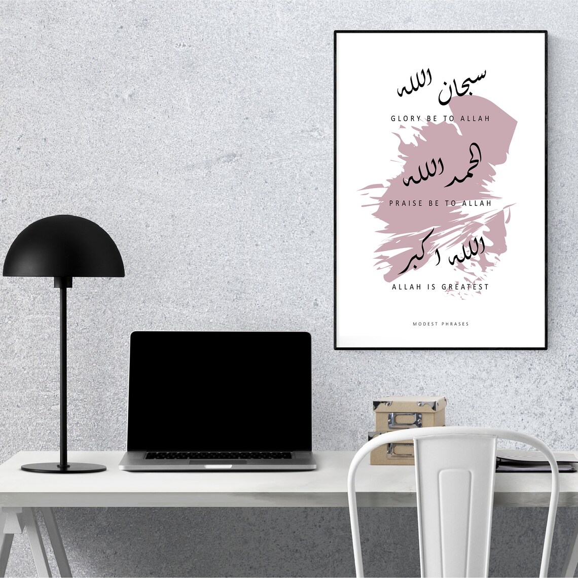 Transform your home or workspace into a sanctuary of peace and mindfulness with our Modest Phrases Islamic Calligraphy Canvas. This exquisite piece of art is more than just a decoration; it is a daily reminder of faith, gratitude, and the greatness of the Creator. Featuring the three "Tasbih" phrases—SubhanAllah (Glory be to Allah), Alhamdulillah (Praise be to Allah), and Allahu Akbar (Allah is Greatest)—this artwork serves as a spiritual anchor in the hustle and bustle of modern life.
