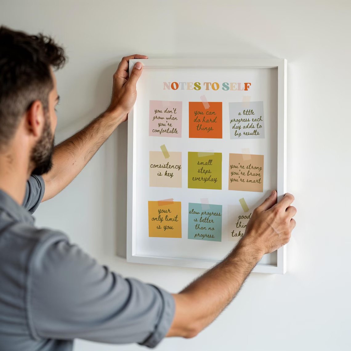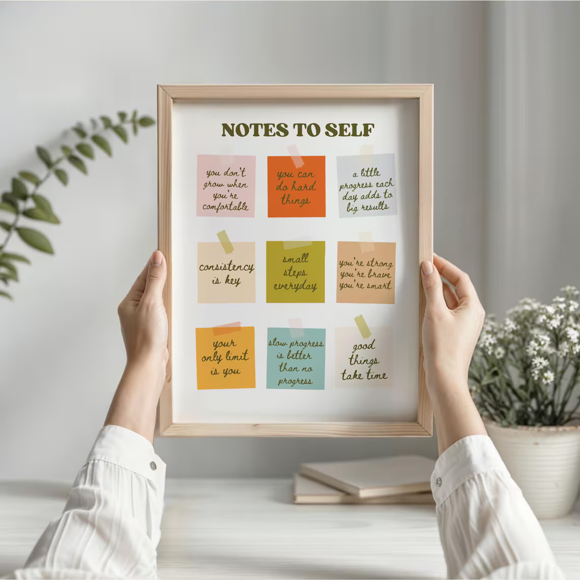 A Daily Dose of Kindness and Courage Transform your workspace or personal sanctuary into a hub of positivity with our "Notes to Self" wall art. We often forget to speak to ourselves with the same grace we offer others; this piece acts as a visual anchor, grounding you in the healthy habits and affirmations necessary for personal growth. It isn’t just a decoration—it’s a mindset captured in a frame.