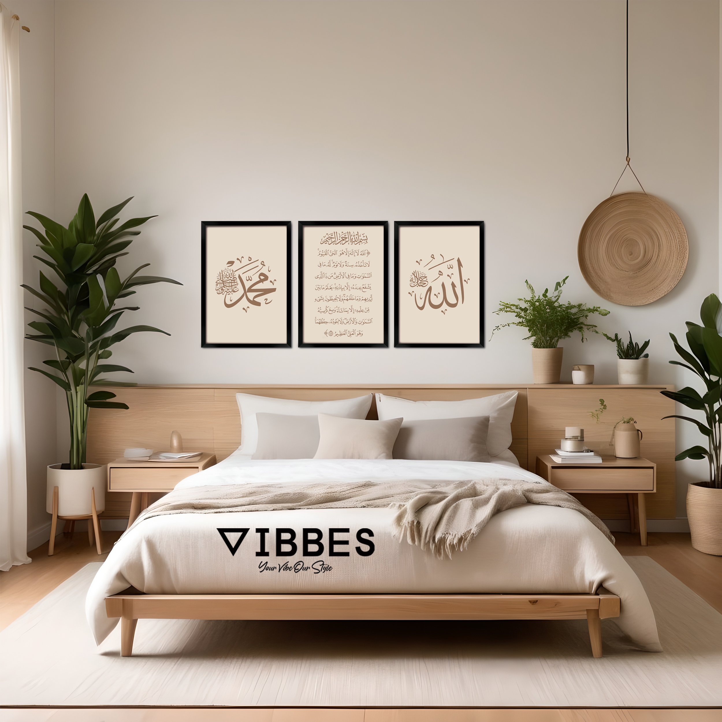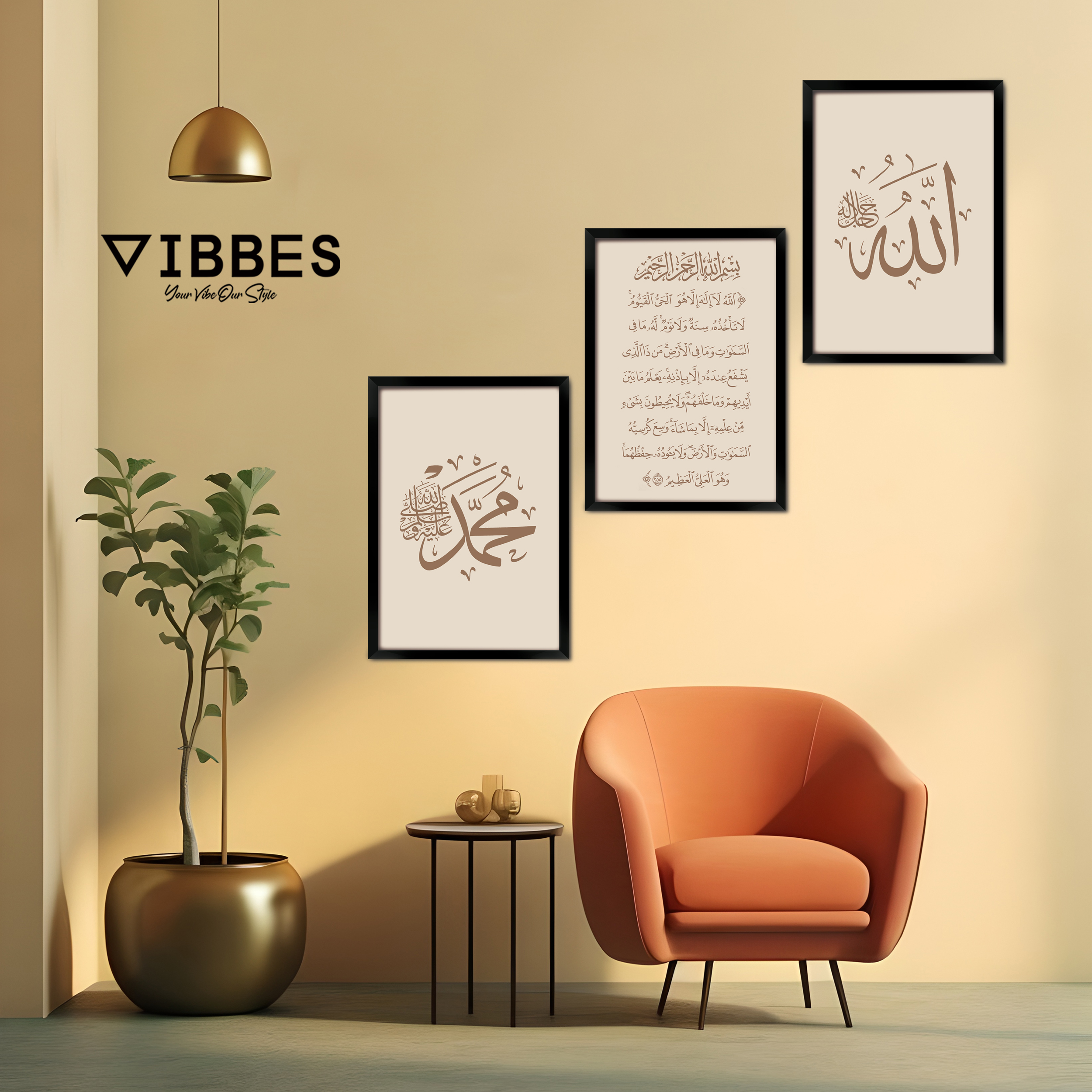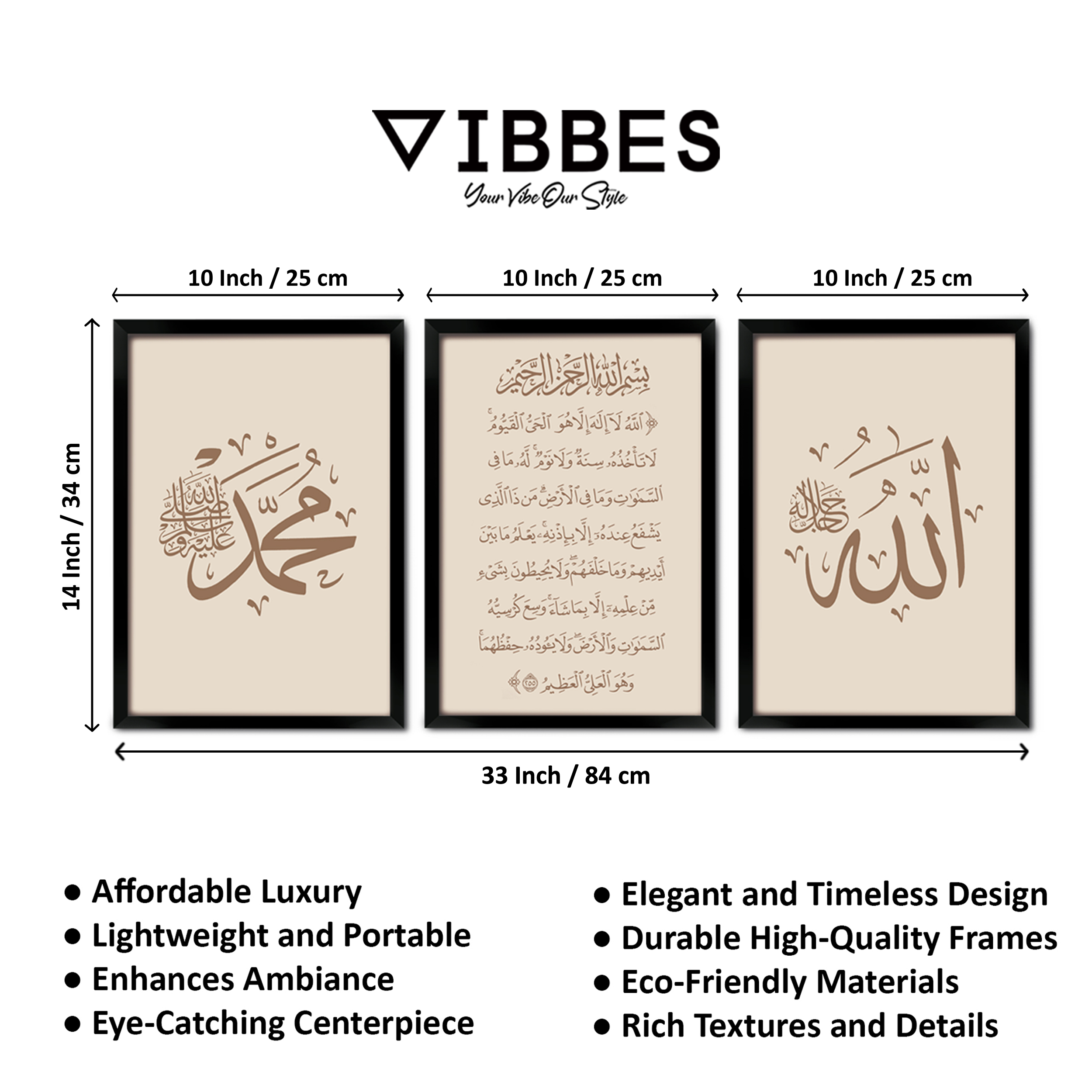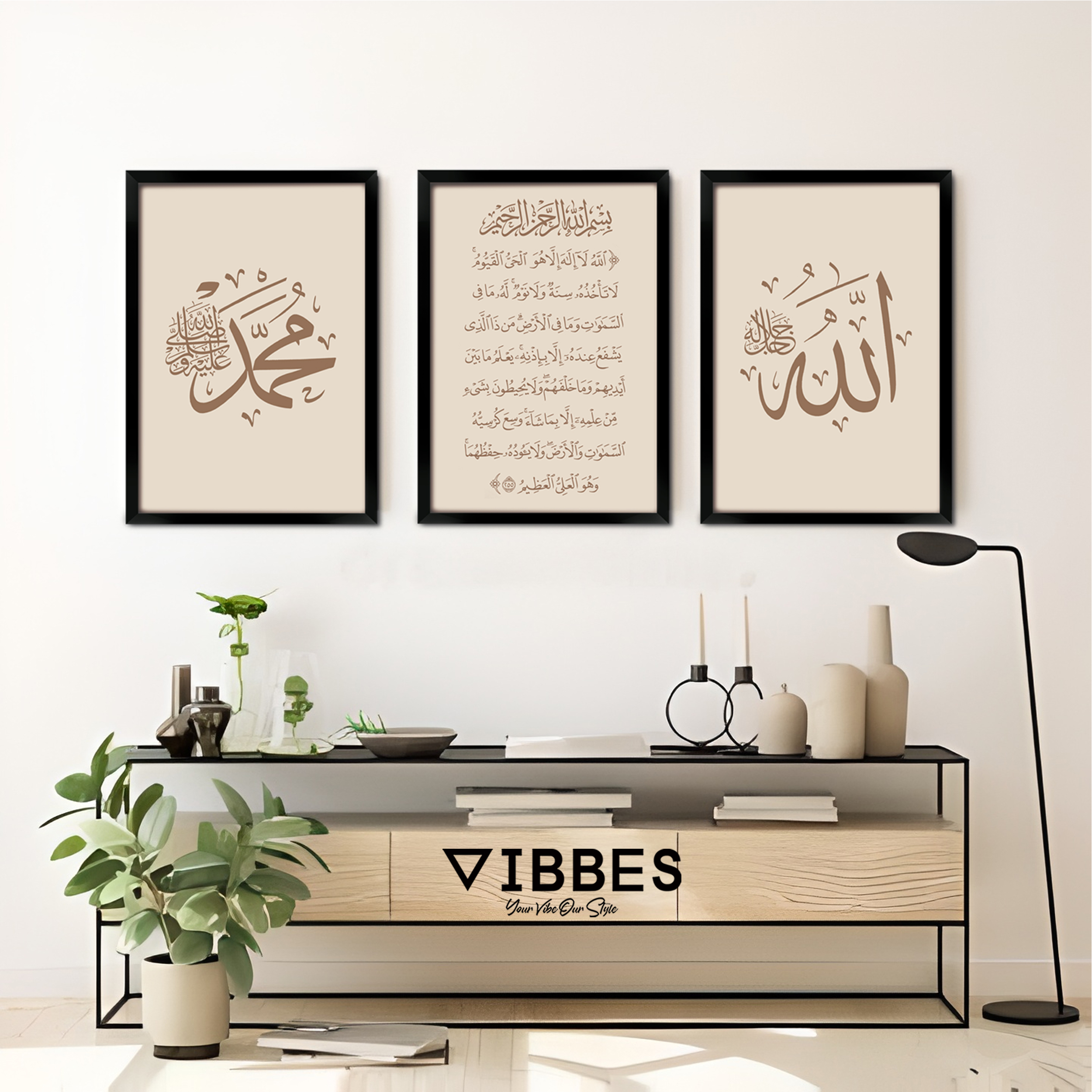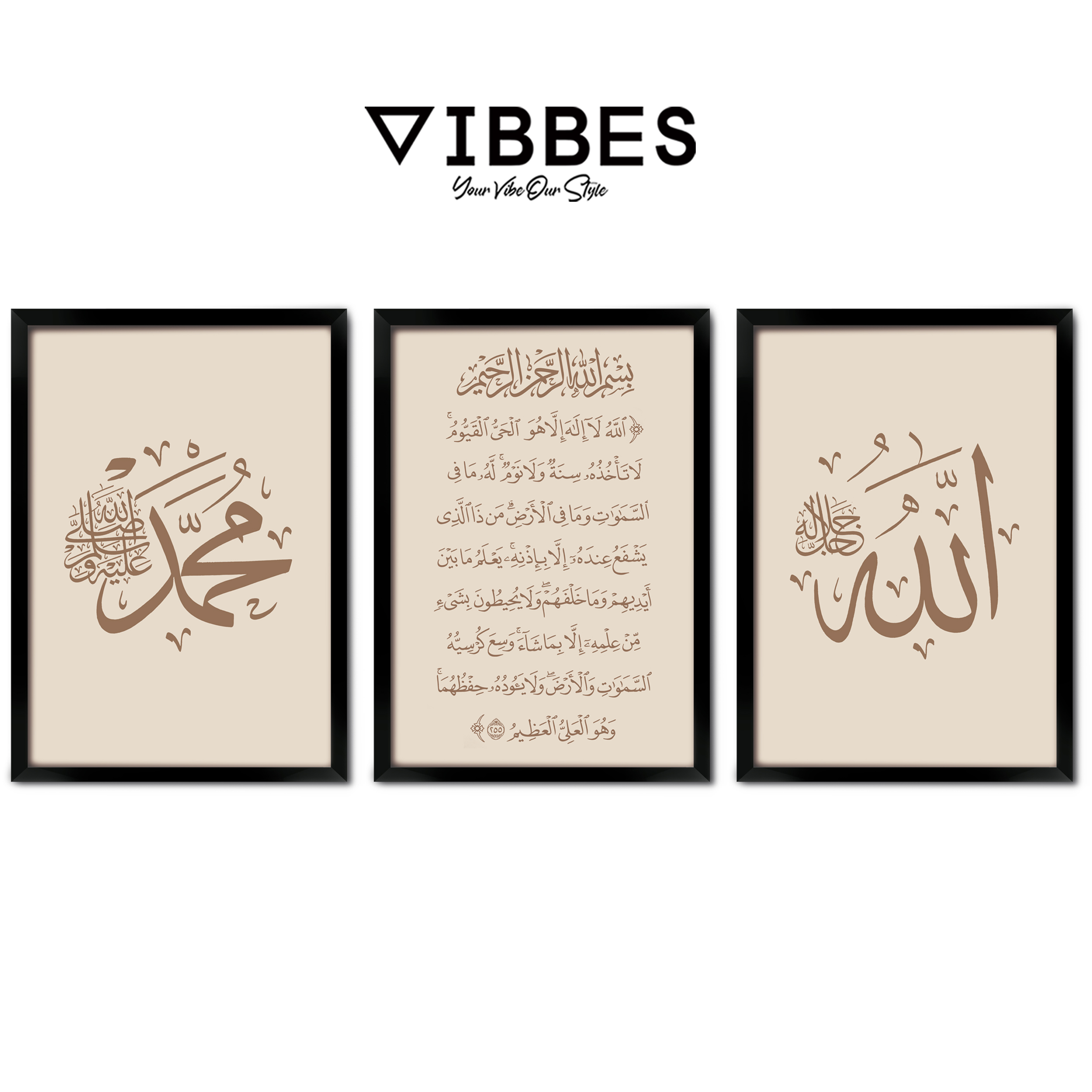 VIBBES wall art collections are crafted for premium quality, modern aesthetics, and meaningful spiritual decor.• Set of 3 Islamic wall art frames