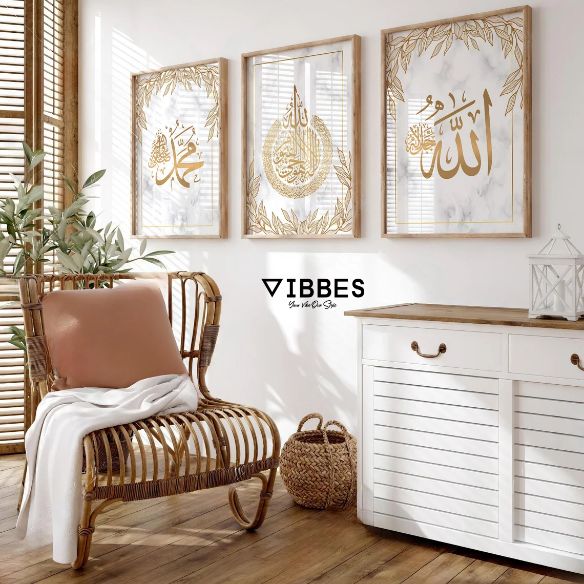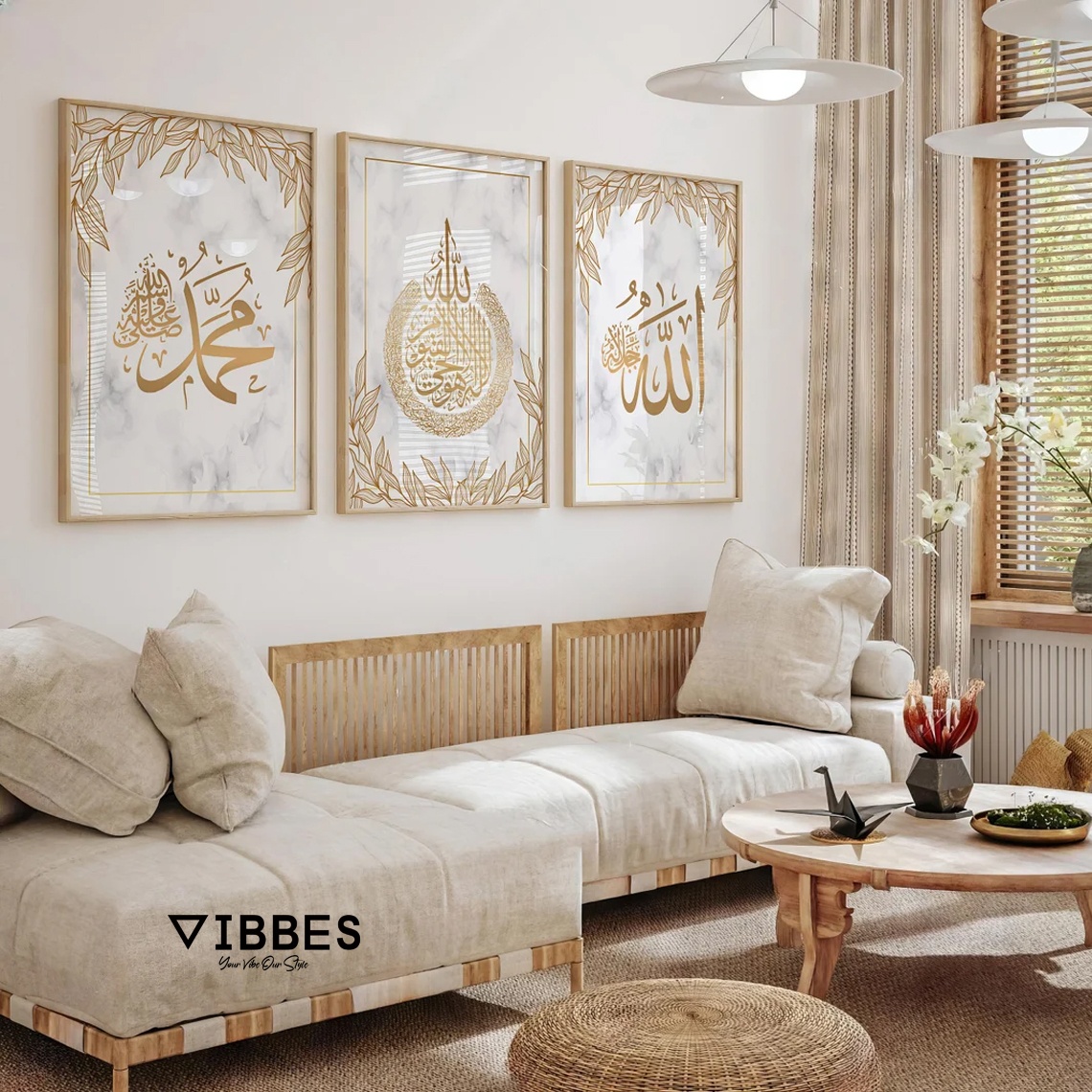 VIBBES wall art collections are crafted to combine modern aesthetics with meaningful Islamic decor.• Set of 3 Islamic wall art frames