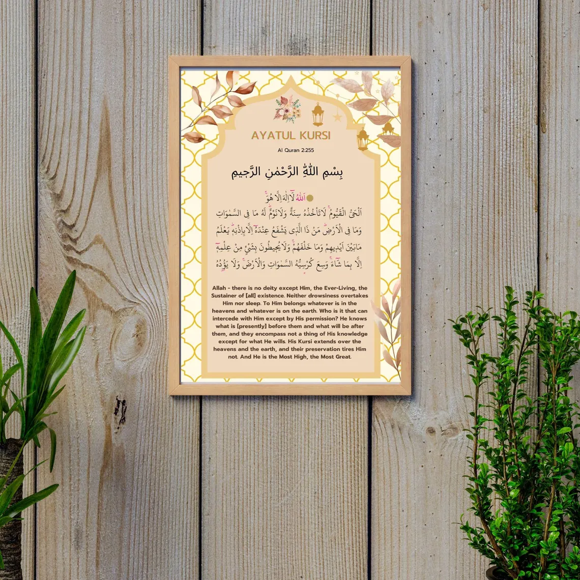 | Image Alt Txt | Vertical wall art featuring Ayatul Kursi on a warm beige background with a yellow geometric lattice border and leaf accents. |